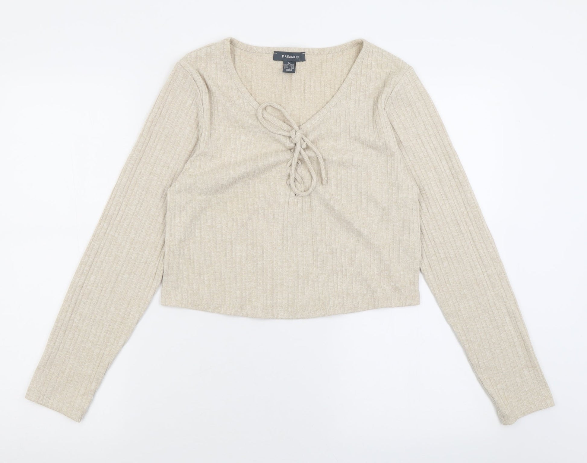 Primark Womens Beige Viscose Cropped T-Shirt Size M V-Neck