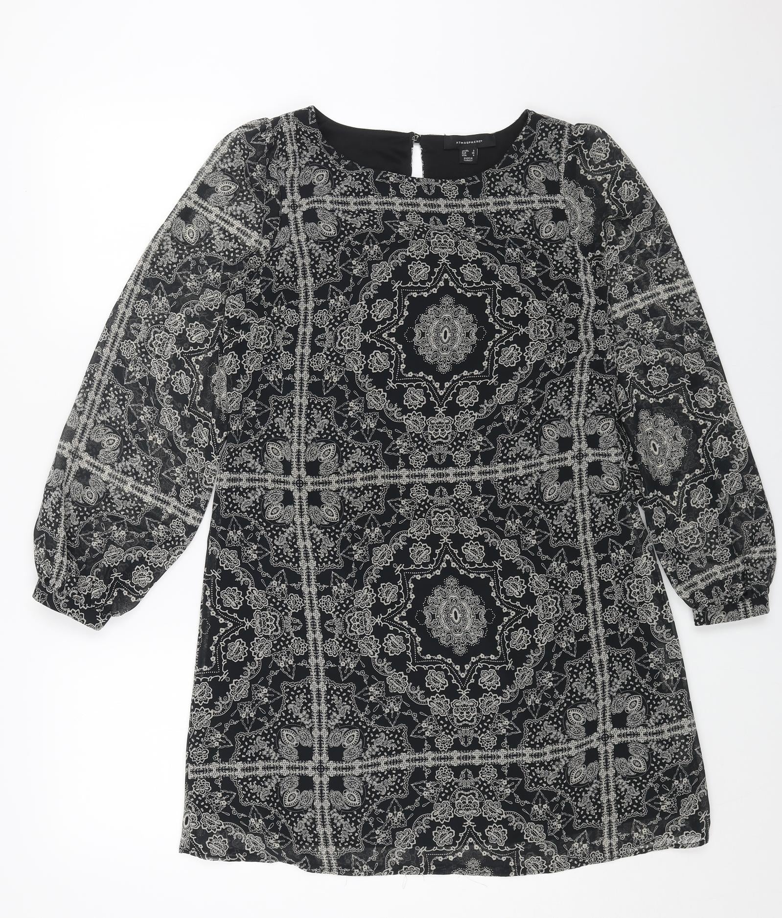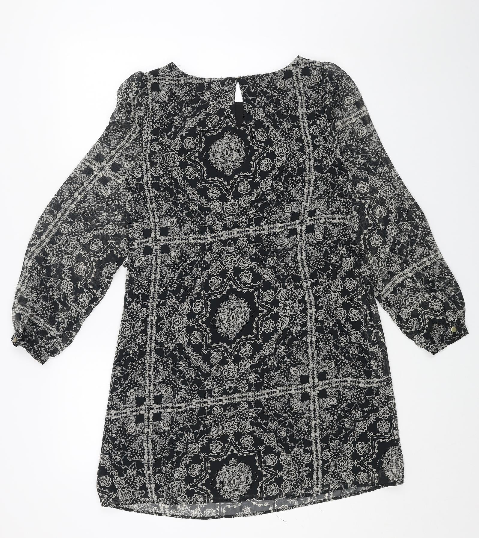 Primark Womens Black Geometric Polyester A-Line Size 8 Round Neck Button