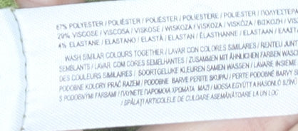 - Material Breakdown: 67% Polyester 29% Viscose 4% Elastane
