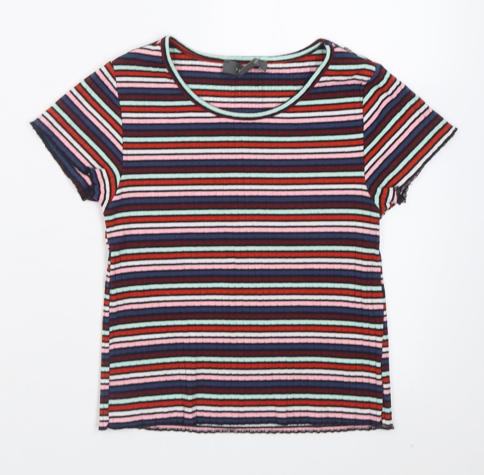 Primark Womens Multicoloured Striped Polyester Cropped T-Shirt Size 6 Crew Neck