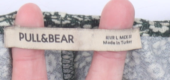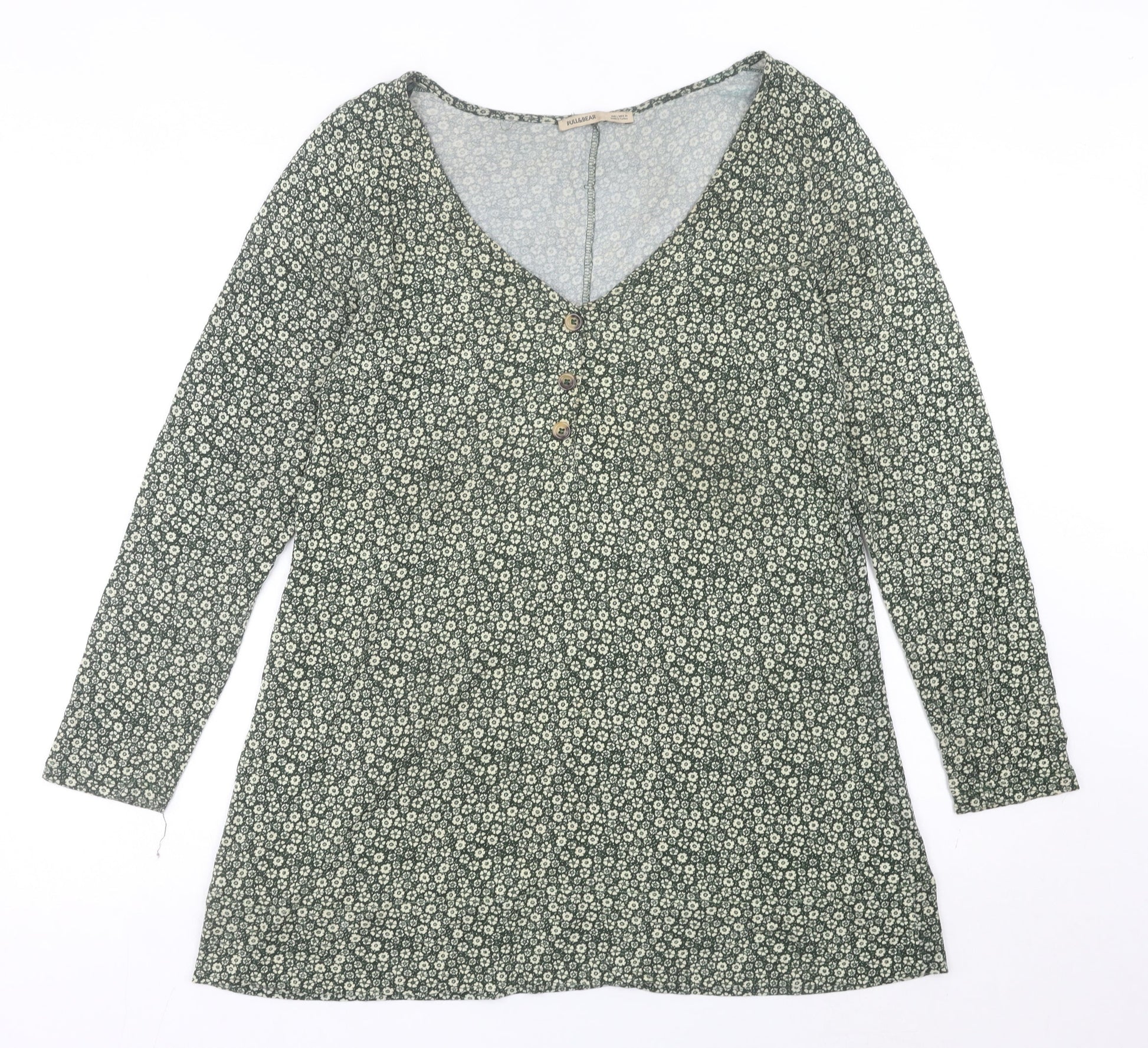 Pull&Bear Womens Green Floral Shift Mini Dress Size 14 V-Neck Long Sleeve