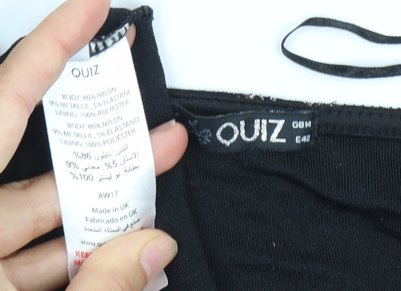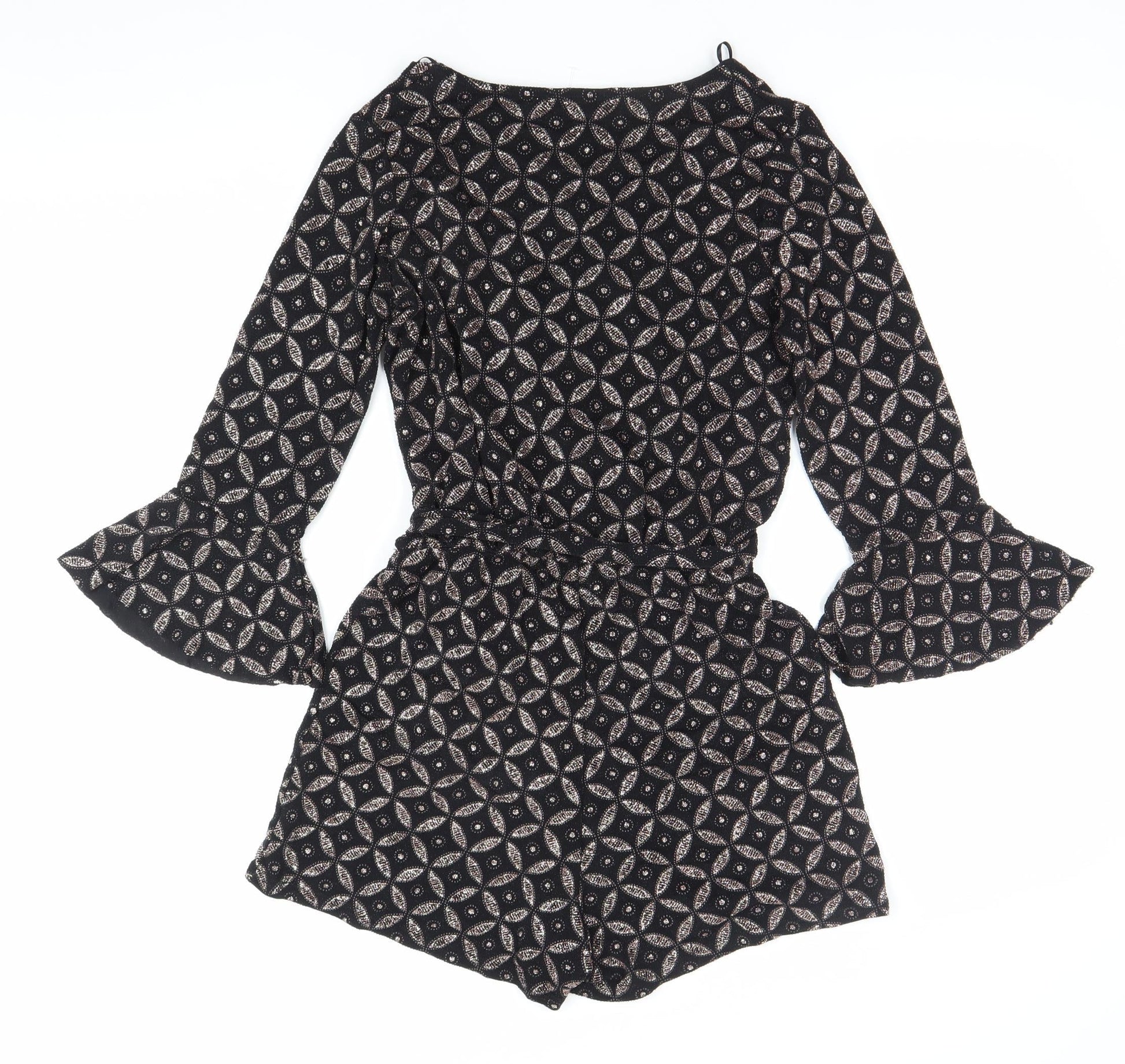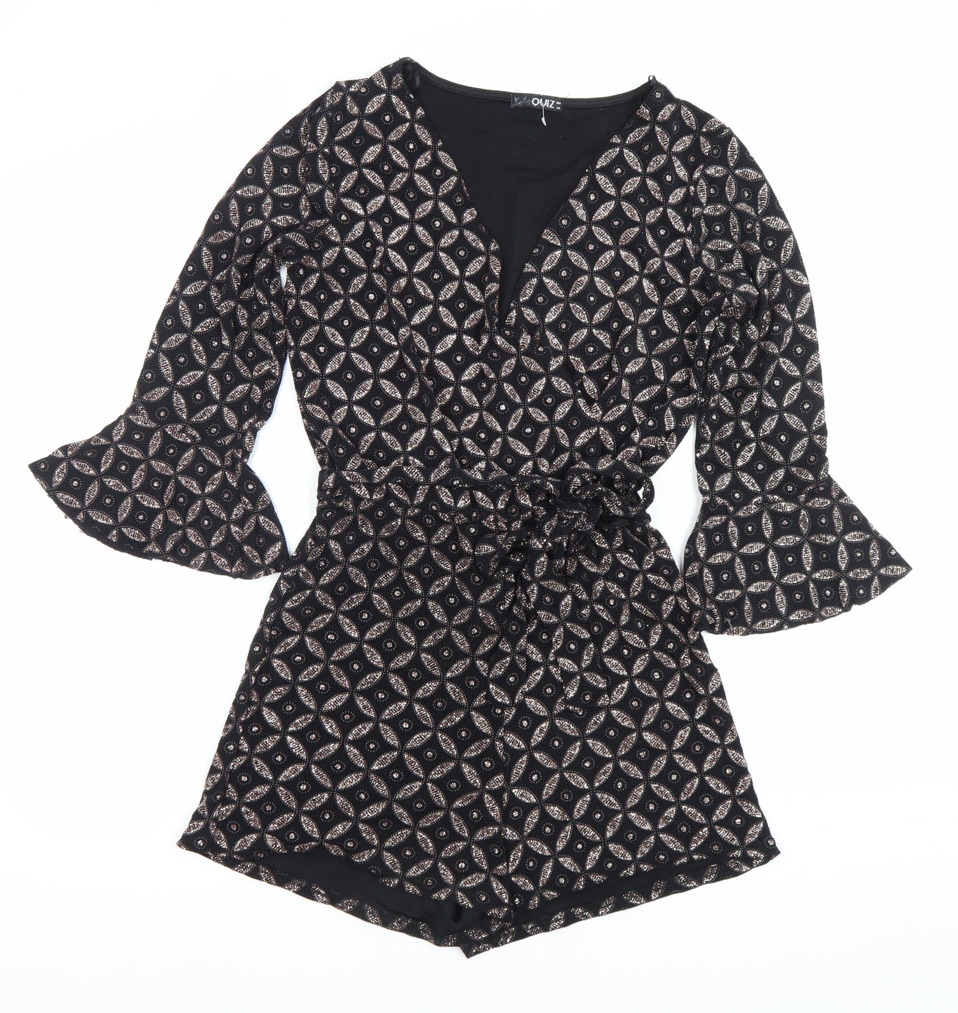 Quiz Women’s Black Metallic Geometric Playsuit Size 14 V-Neck 3/4 Sleeve