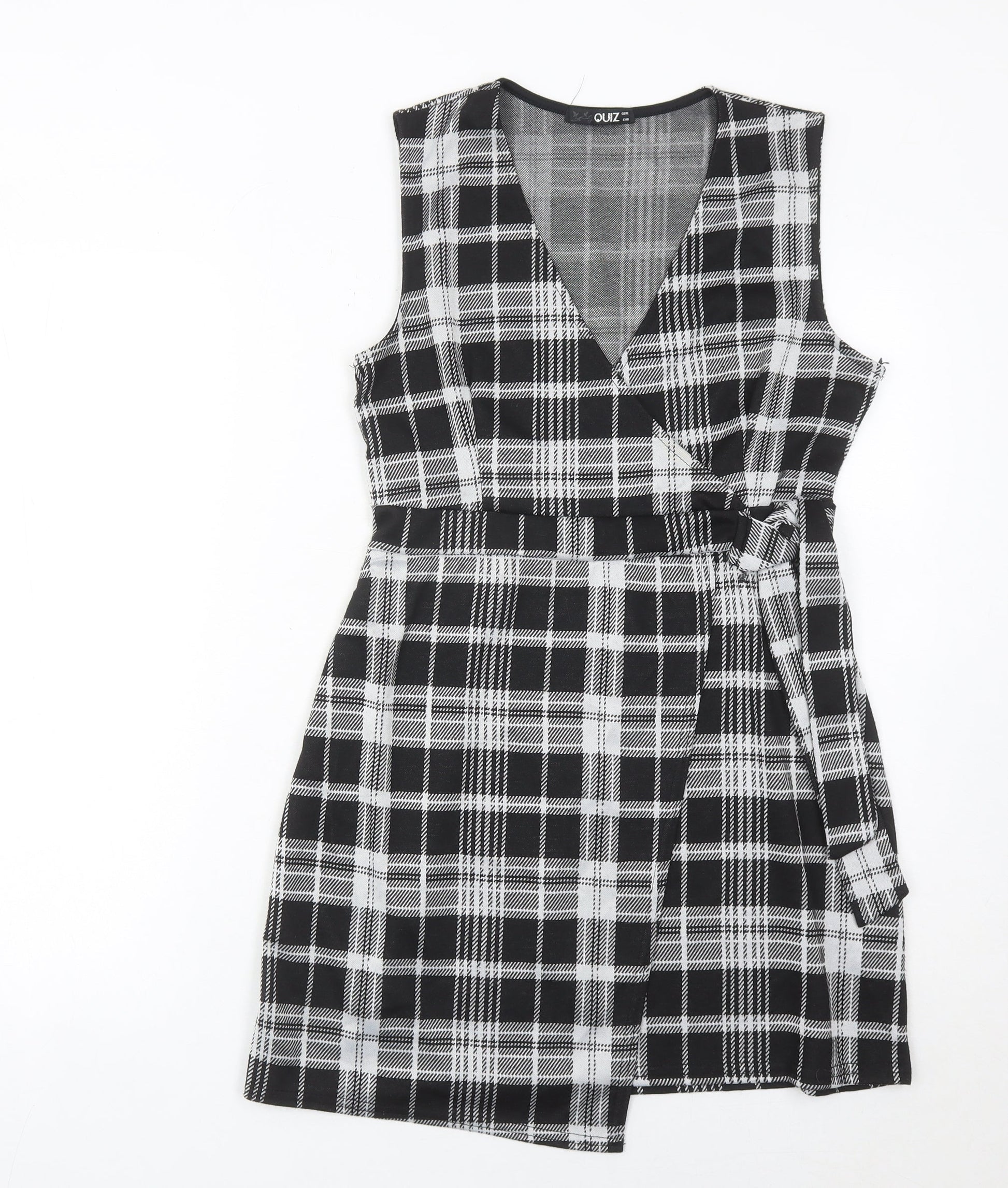 Quiz Womens Black Checked Plaid Wrap Dress Size 12 Sleeveless