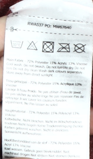 - Material Breakdown: 72% Polyester 15% Acrylic 13% Viscose