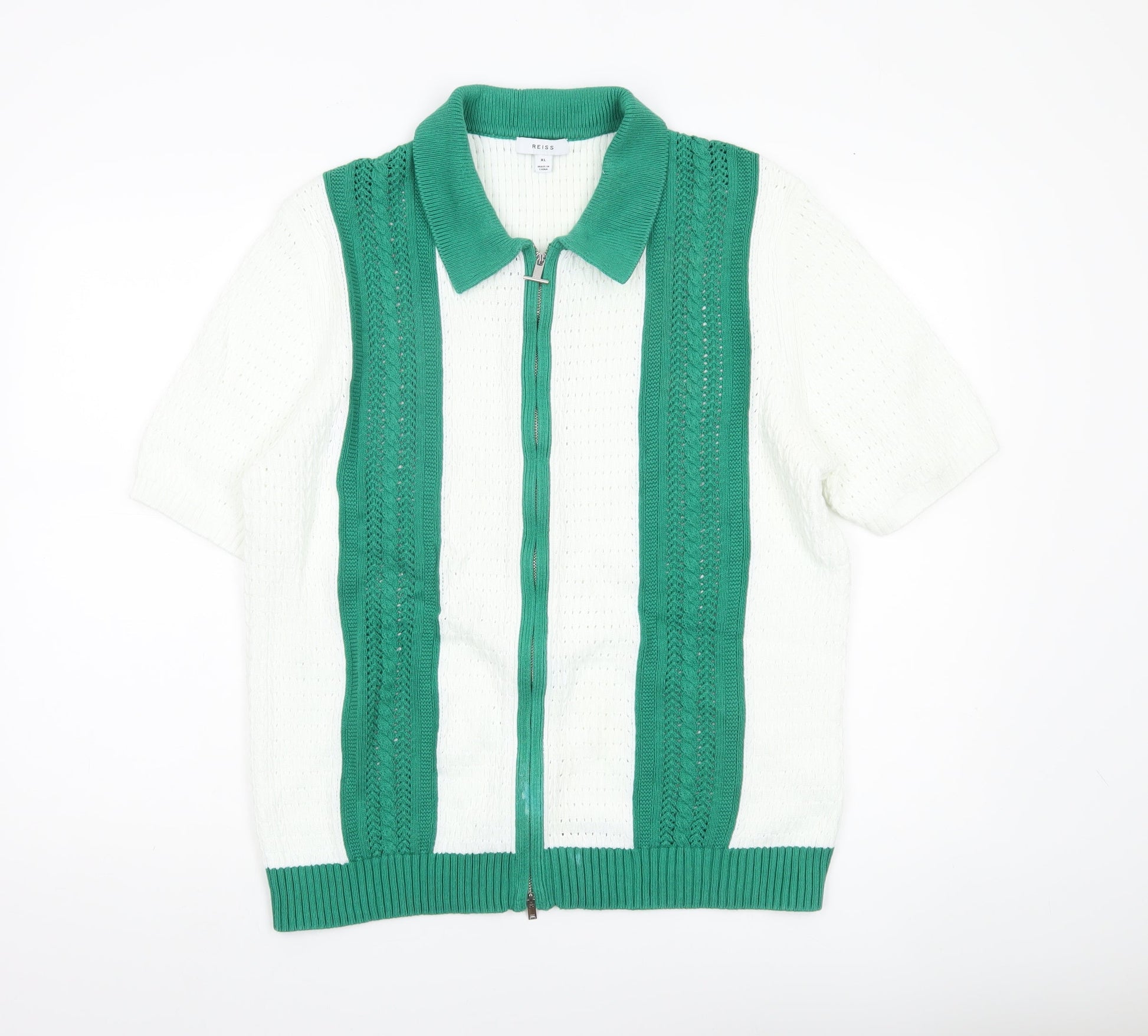 Reiss Mens XL Green White Collared Full Zip Short Sleeve Cotton Jumper