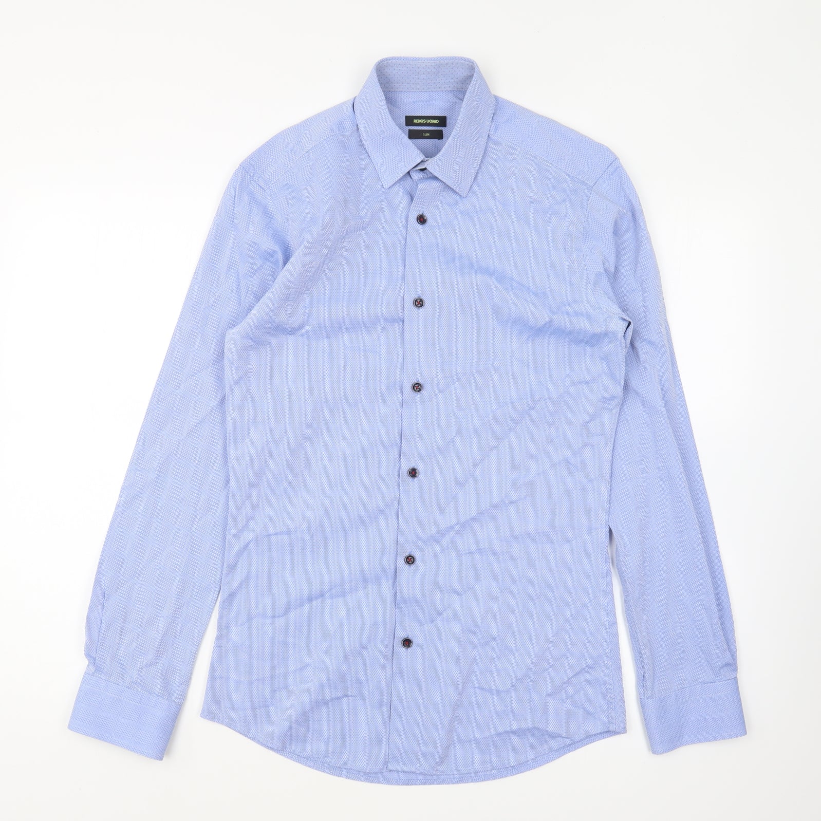 Remus Uomo Mens Blue Geometric Polyester Button-Up Size 14.5 Collared Button