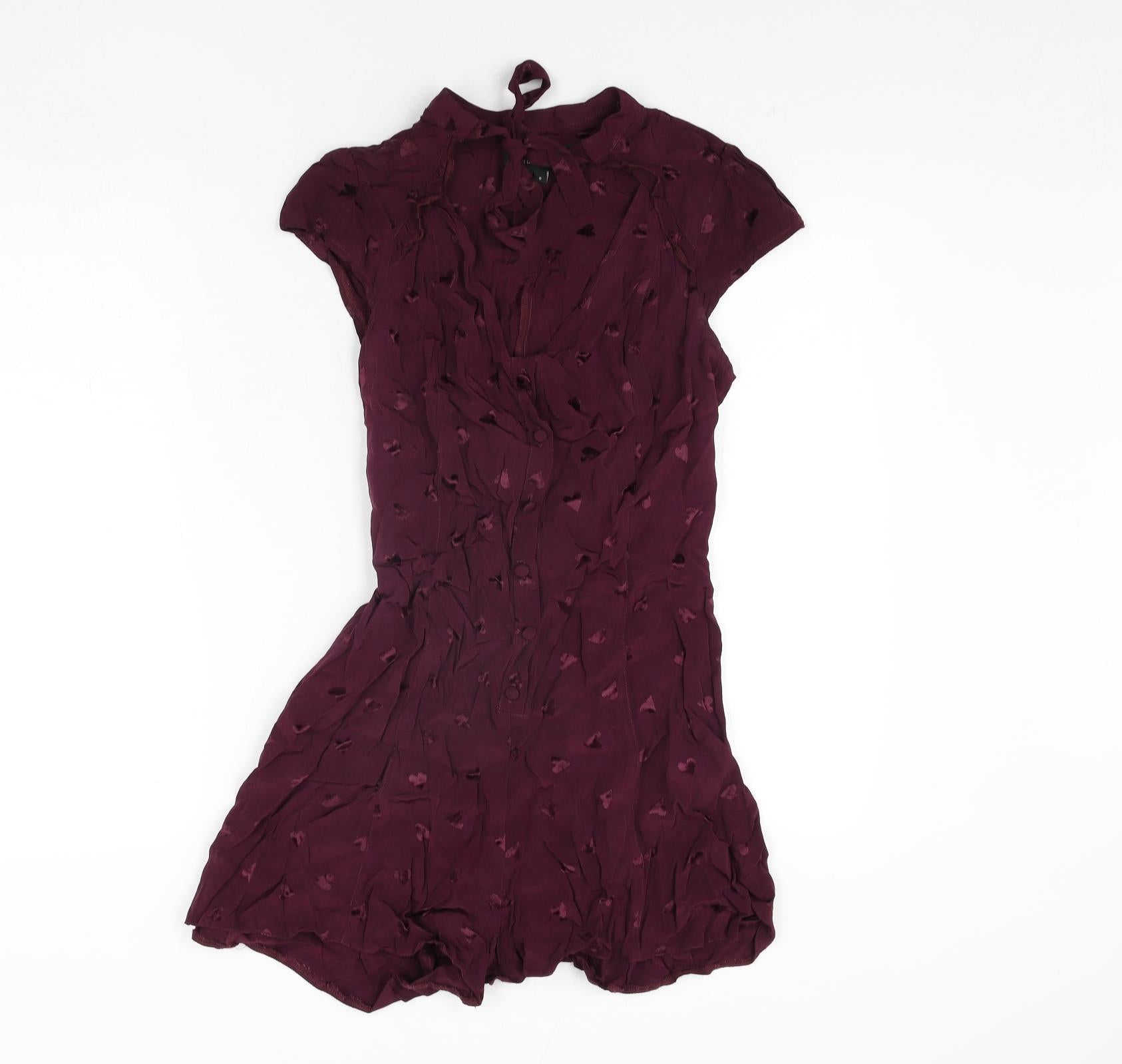 River Island Womens Purple Geometric Viscose Playsuit One-Piece Size 8 Button - Heart Pattern Keyhole Neck Bow Belted