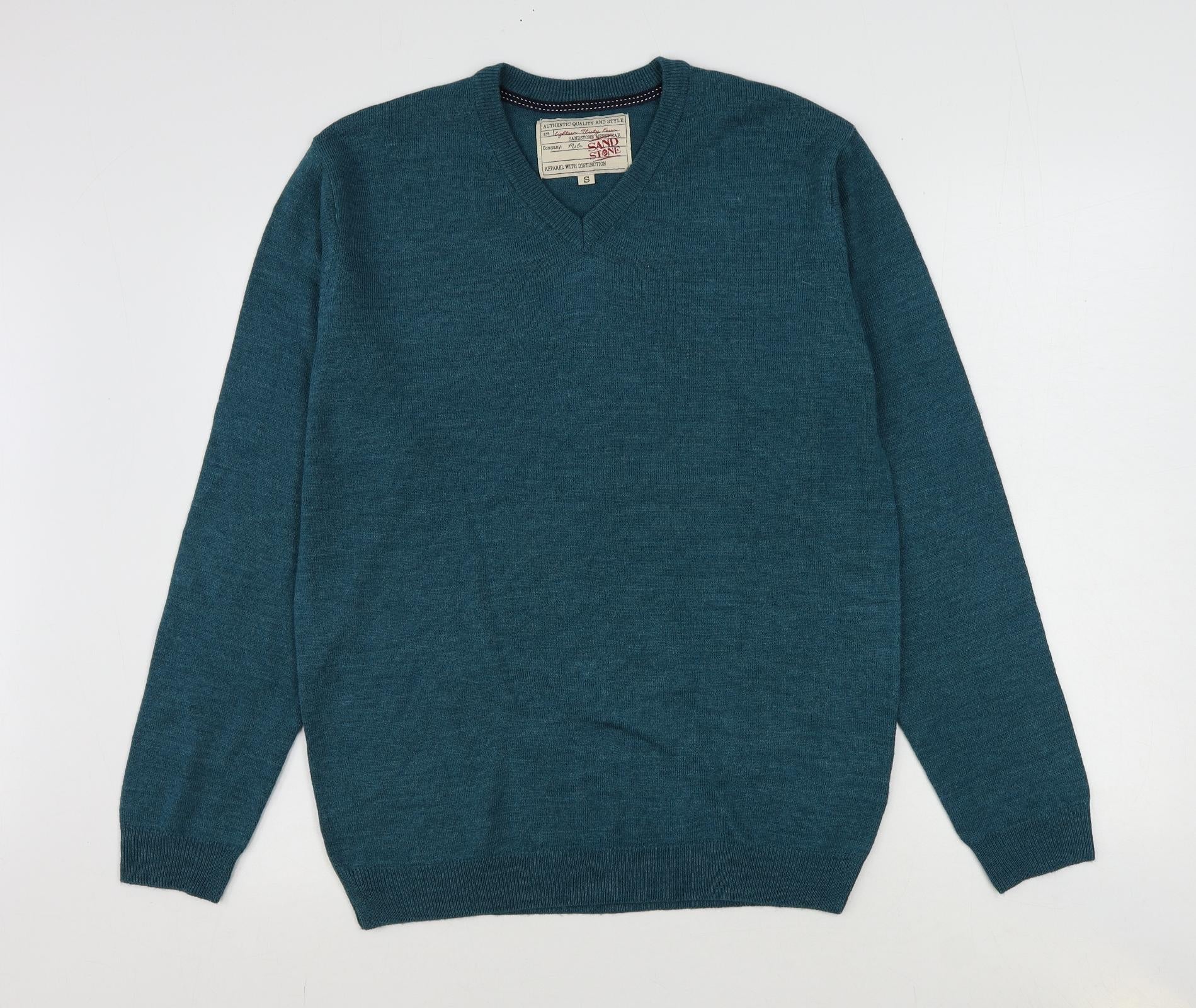 Sand Stone Mens Blue V-Neck Acrylic Pullover Jumper Size S Long Sleeve