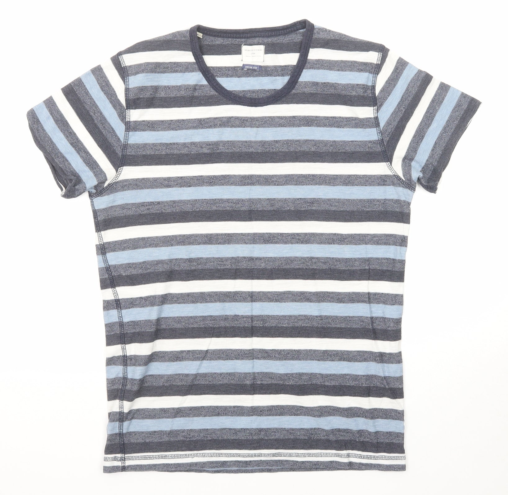 Selected Homme Mens Blue Striped Cotton T-Shirt Size S Round Neck