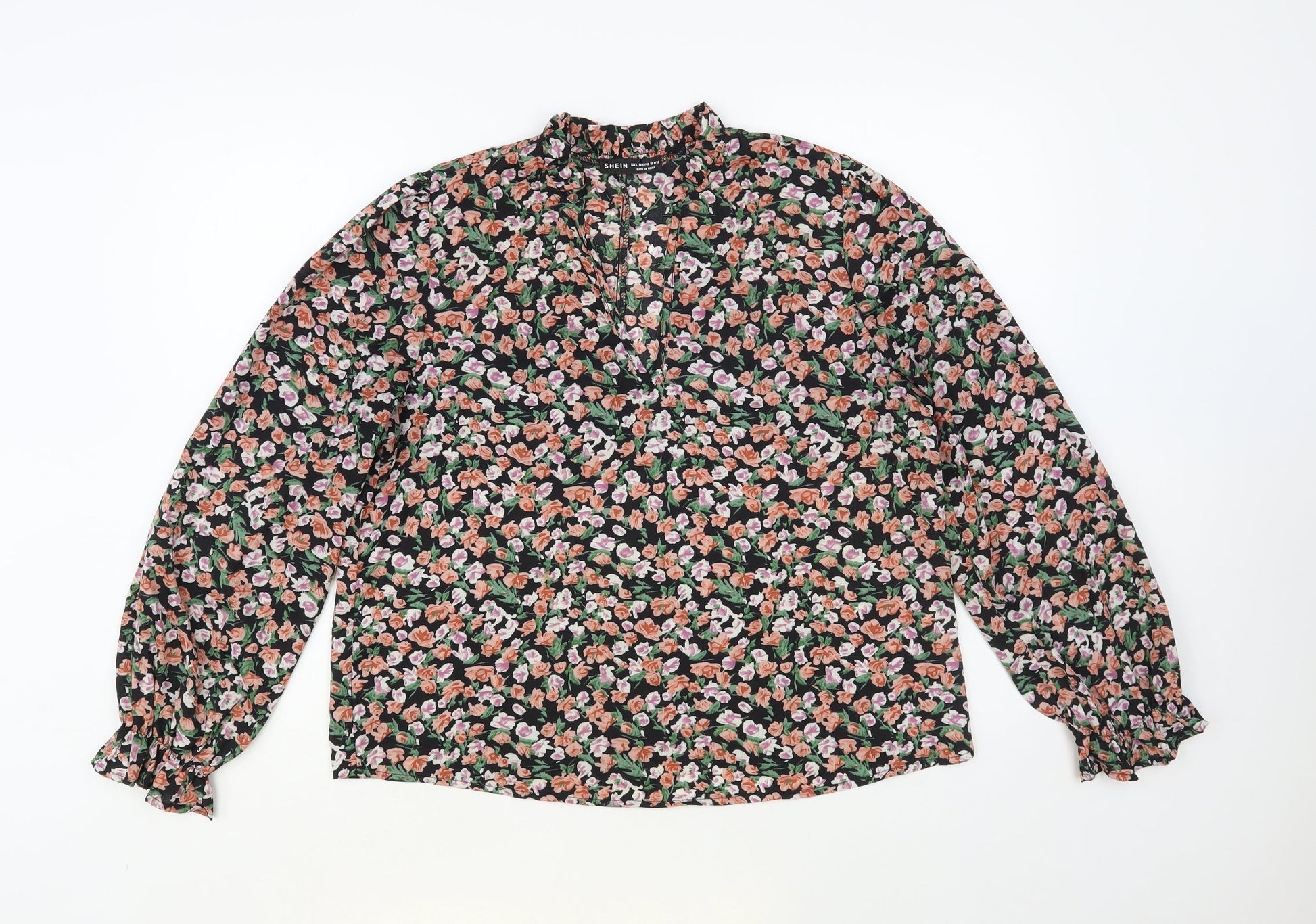 SheIn Womens Black Floral Polyester Basic Blouse Size L V-Neck