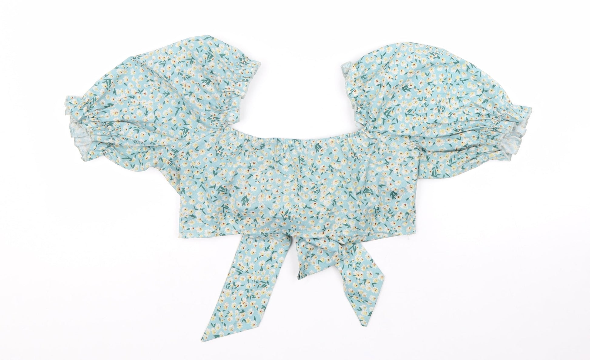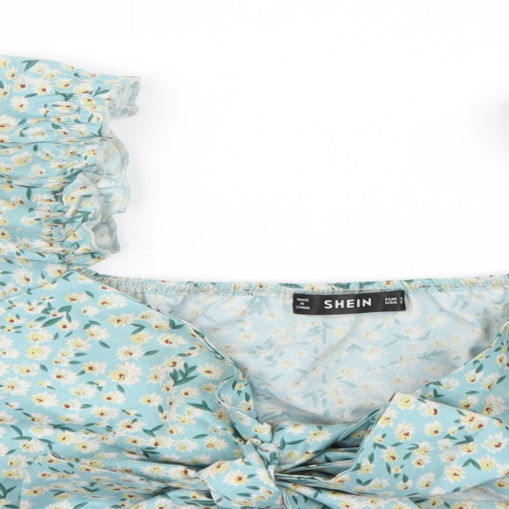 SheIn Womens Blue Floral Polyester Cropped Blouse Size S Sweetheart - Puff Sleeve Tie Front