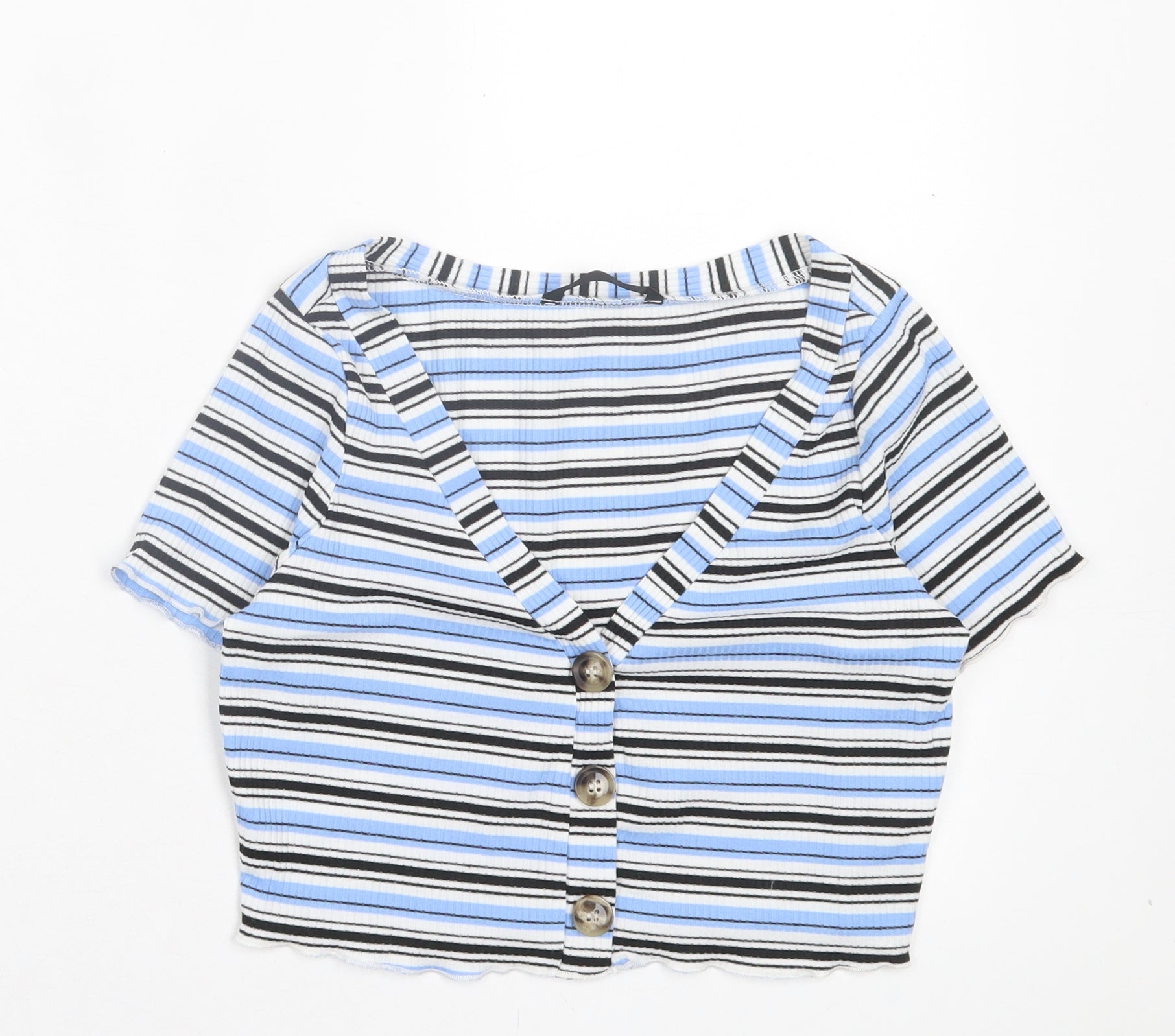 SheIn Womens Blue Striped Polyester Cropped T-Shirt Size XS V-Neck