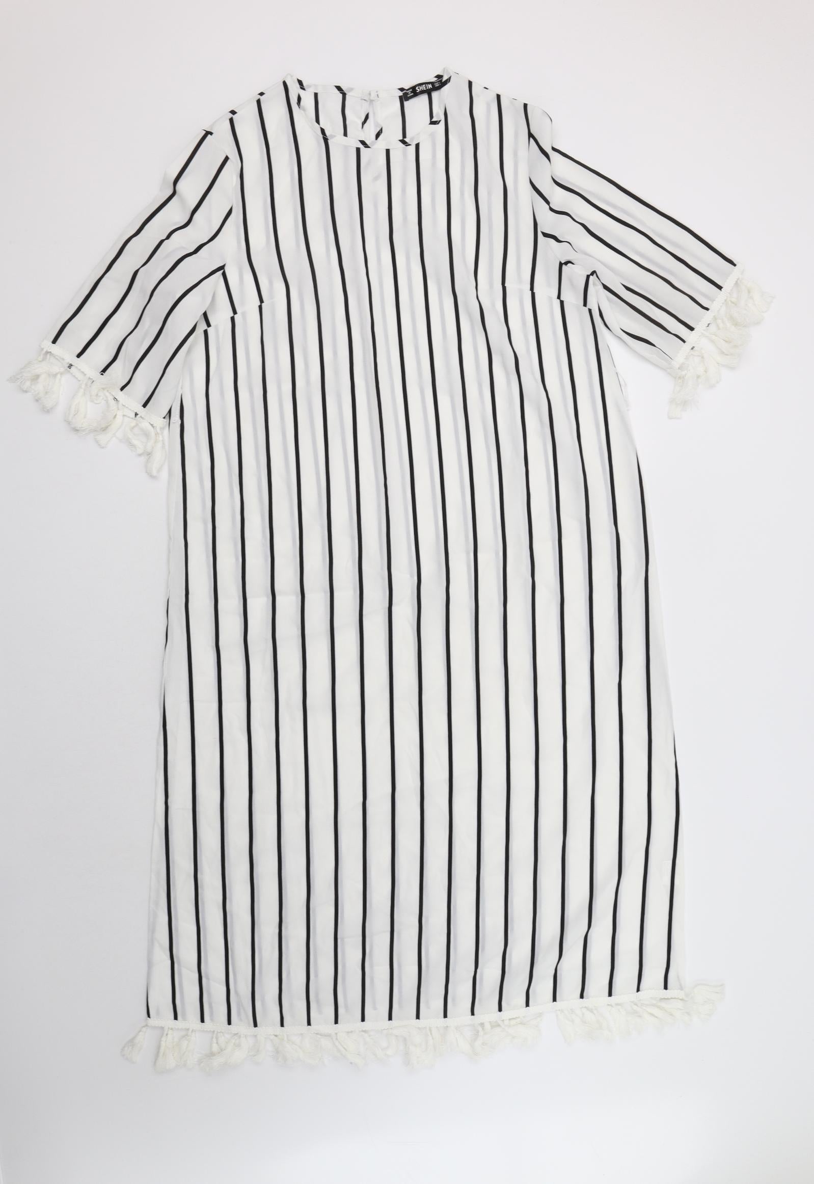 SheIn Womens White Striped Polyester A-Line Size L Crew Neck Button