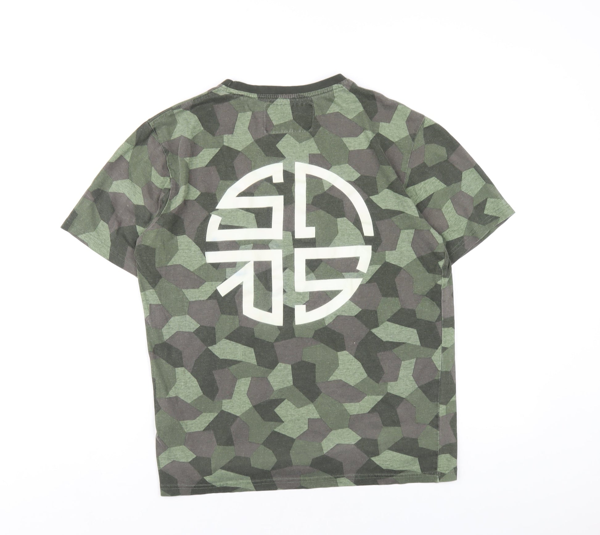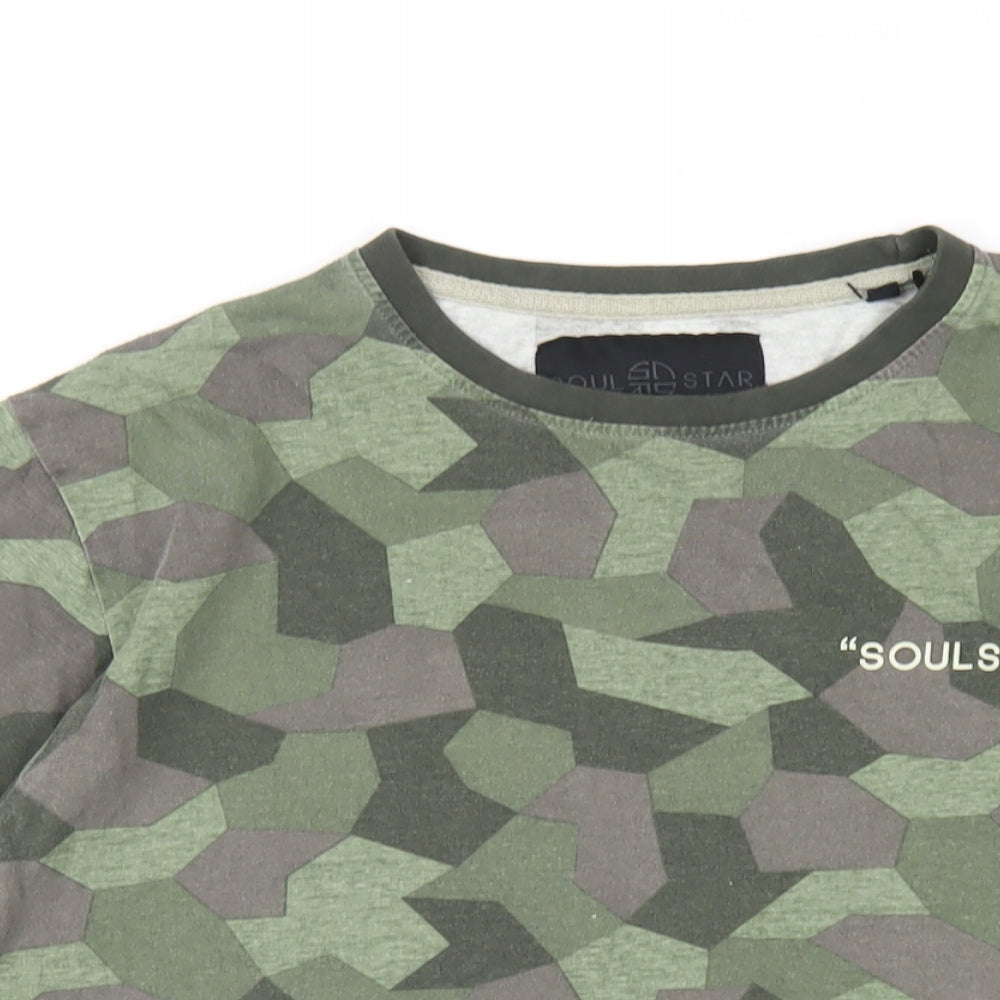 Soul Star Mens Green Geometric Cotton T-Shirt Size M Round Neck