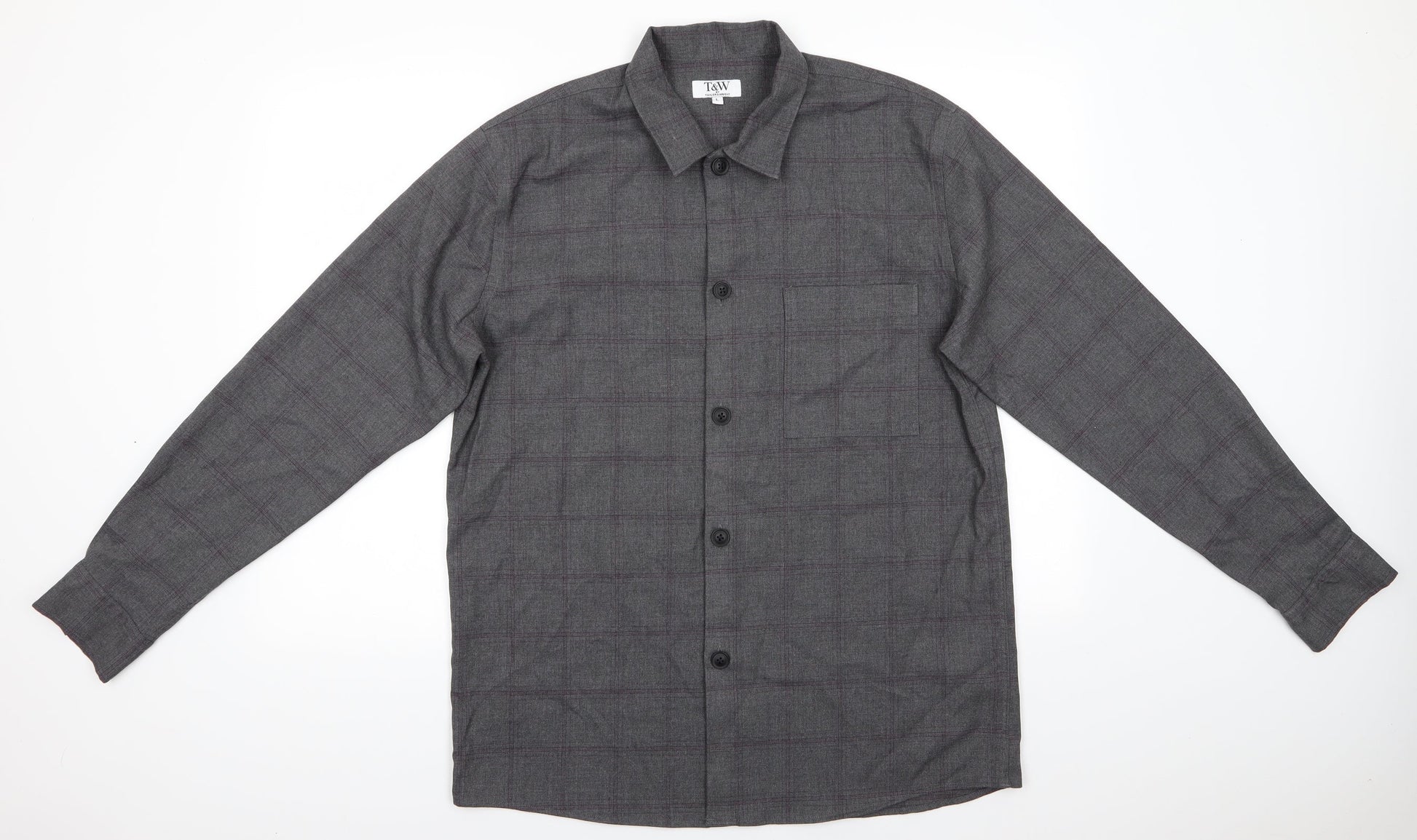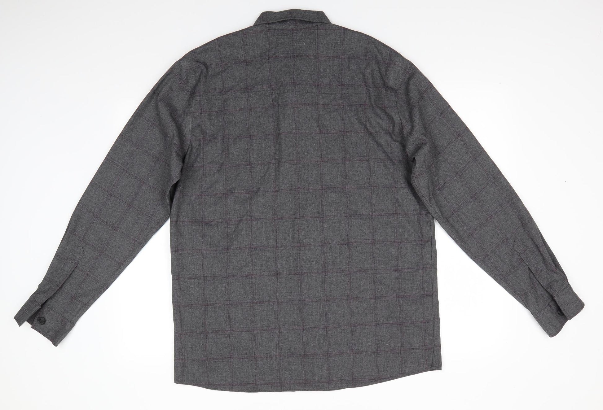 T&W by Taylor & Wright Mens Grey Check Polyester Button-Up Size L Collared Button - Dark Grey with Fine Burgandy Line checks