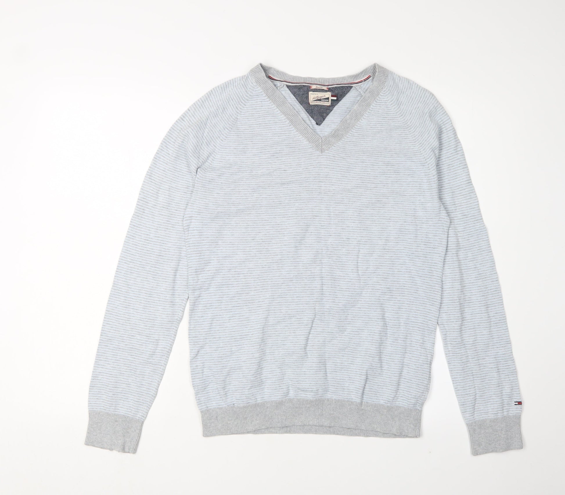 Tommy Hilfiger Men's Grey V-Neck Striped Pullover - S