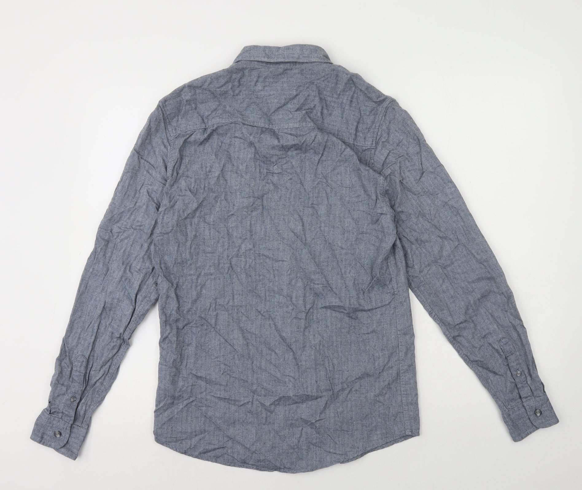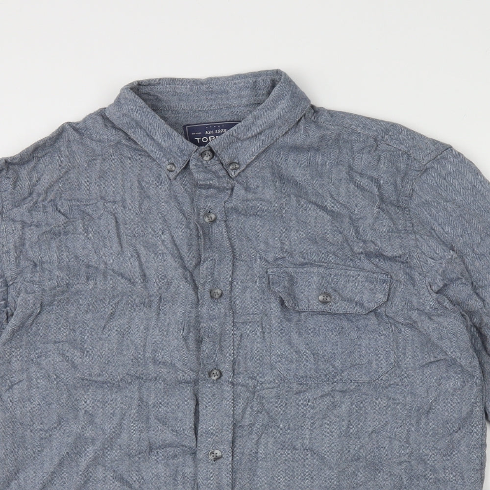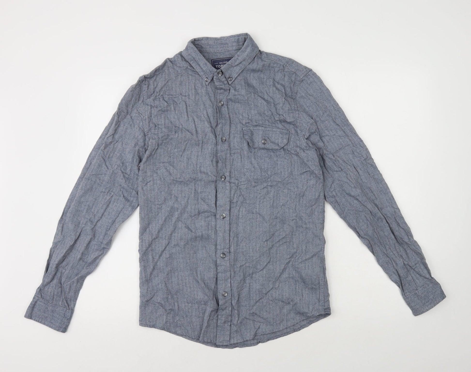 Topman Mens Blue Herringbone Cotton Button-Up Size S Collared Button