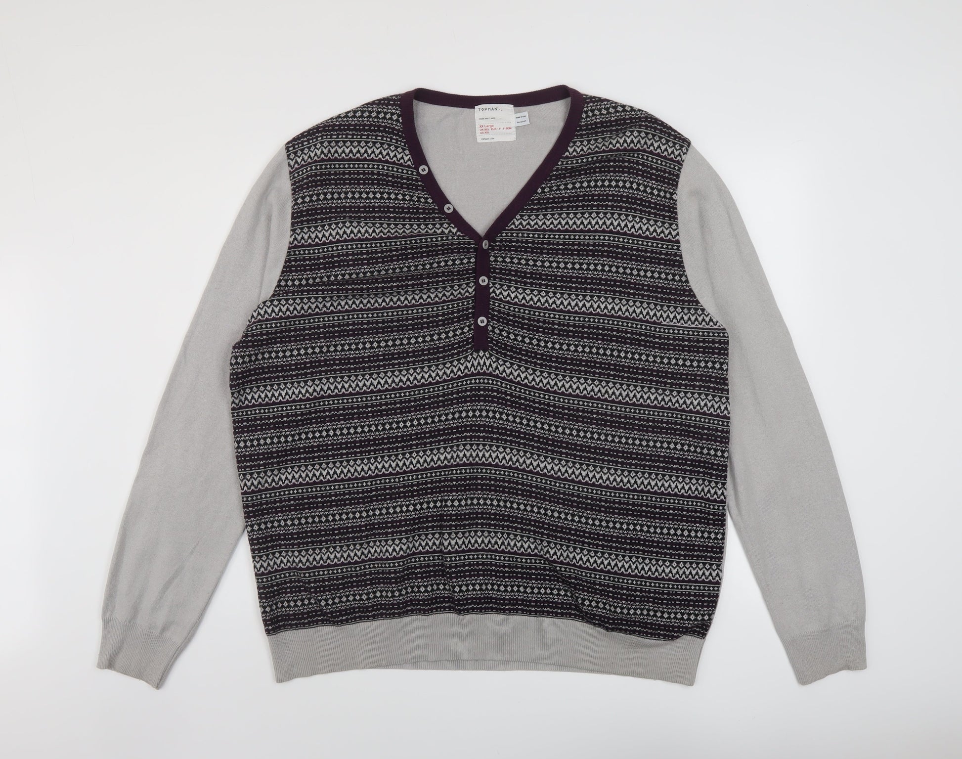 Topman Mens Green V-Neck Geometric Cotton Pullover Jumper Size 2XL Long Sleeve