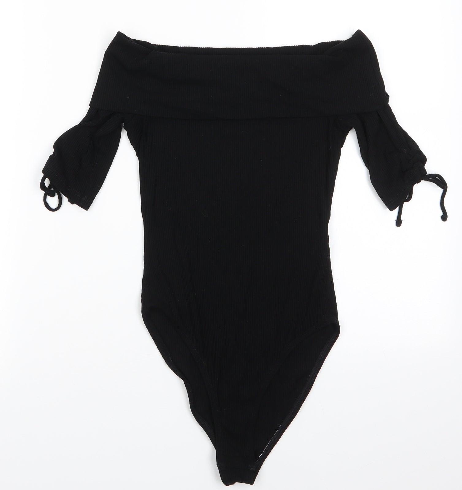 Topshop Womens Black Viscose Bodysuit One-Piece Size 8 Snap - Drawstring sleeves Ribbed fabric