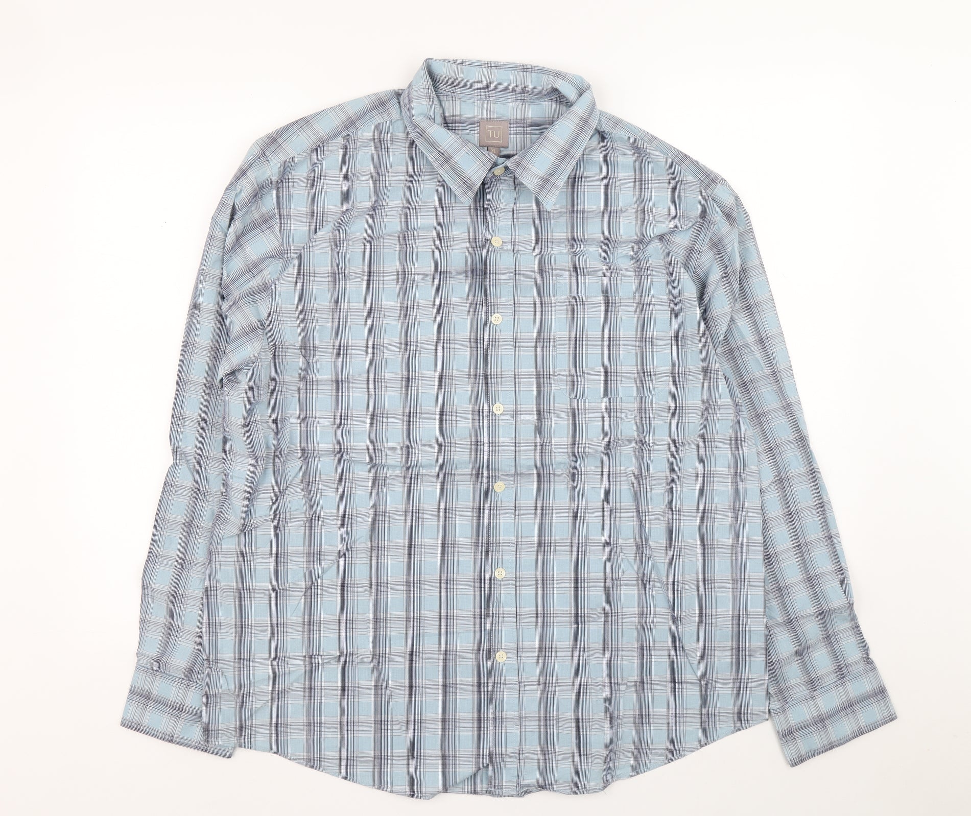 TU Mens Blue Plaid Cotton Button-Up Size XL Collared Button