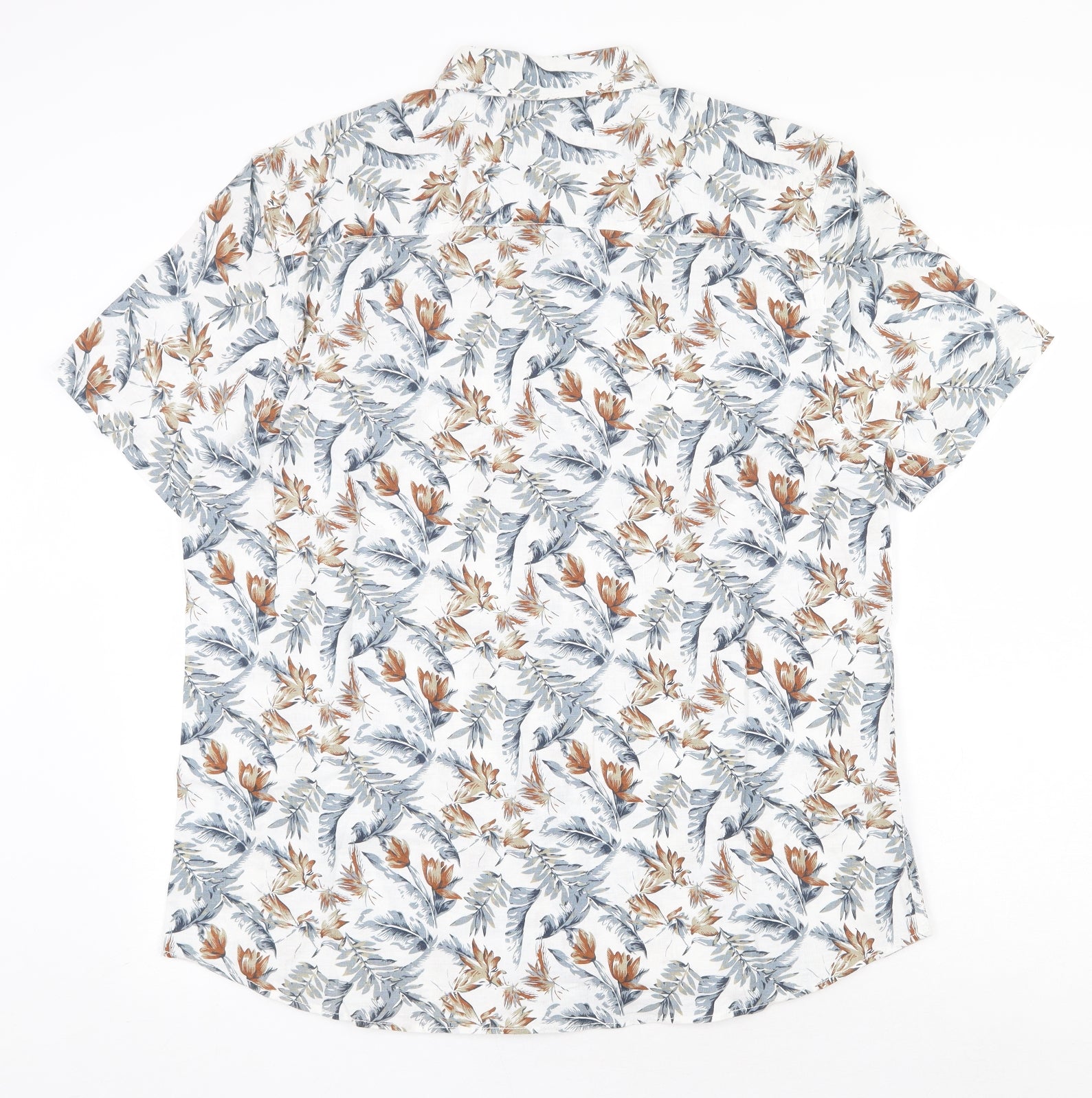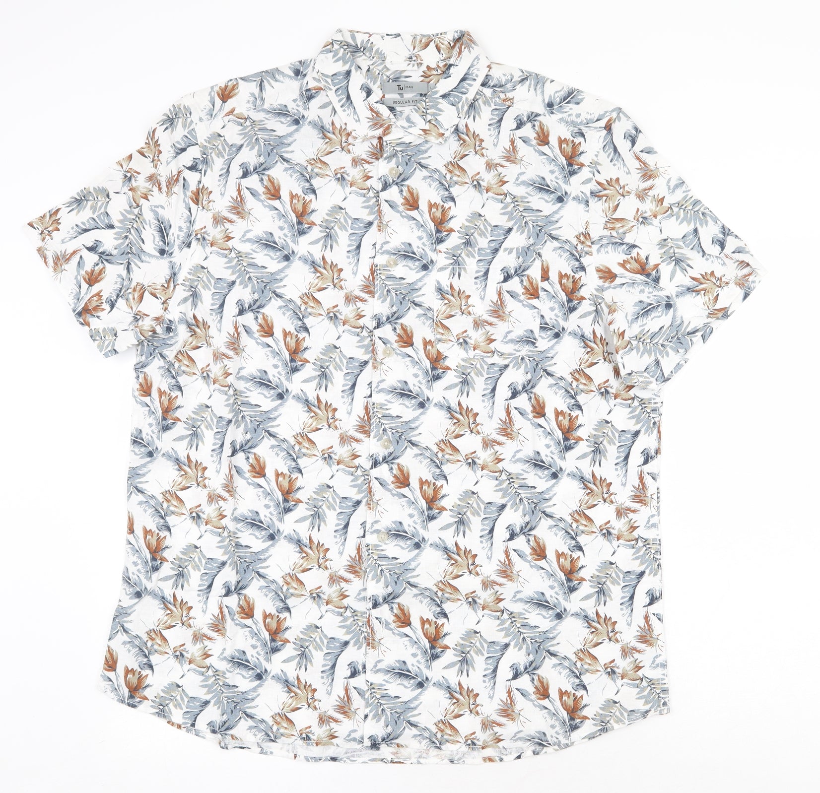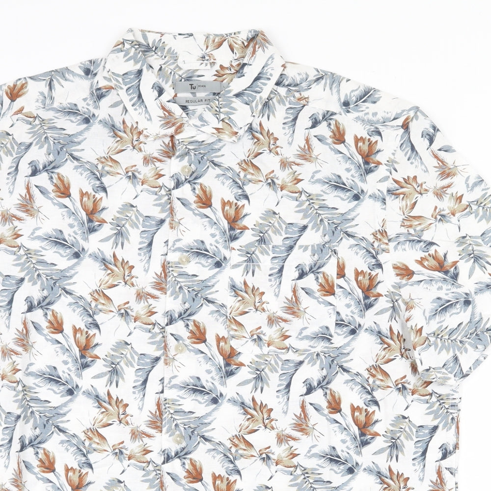 TU Mens White Geometric Linen Button-Up Size L Collared Button - Leaf Print