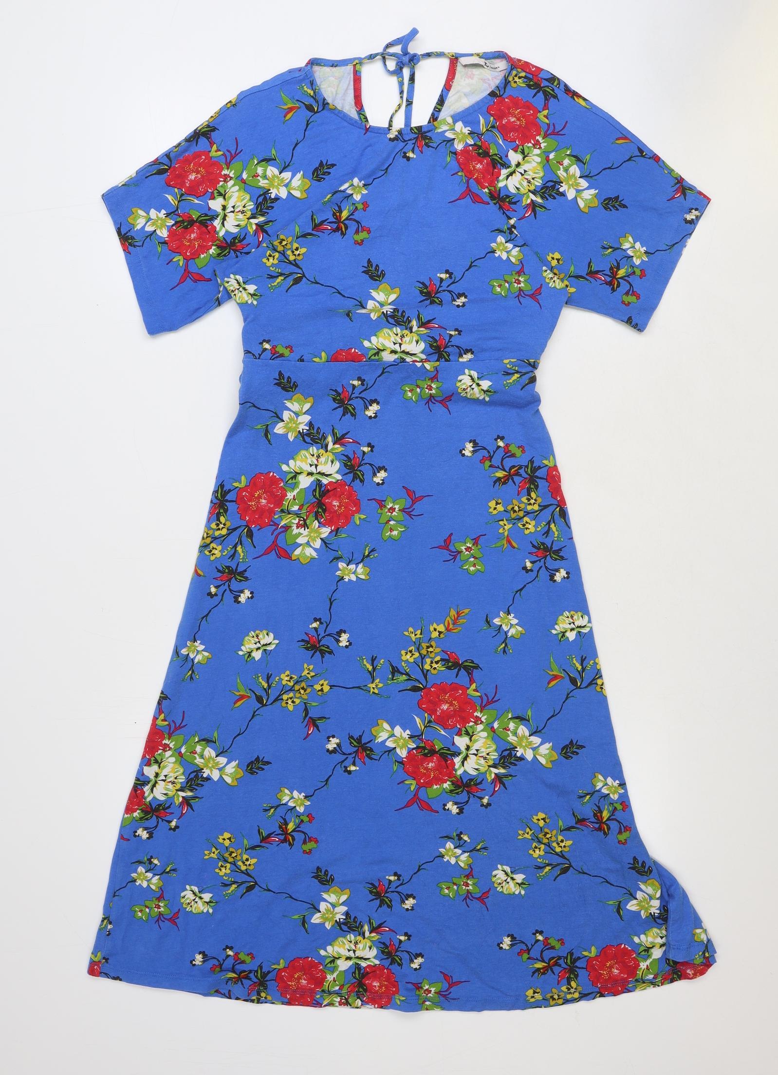 TU Womens Blue Floral Viscose A-Line Size 8 Boat Neck Tie