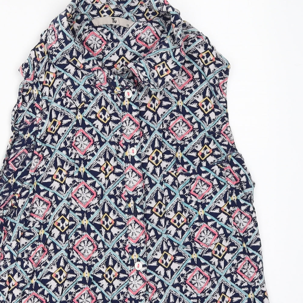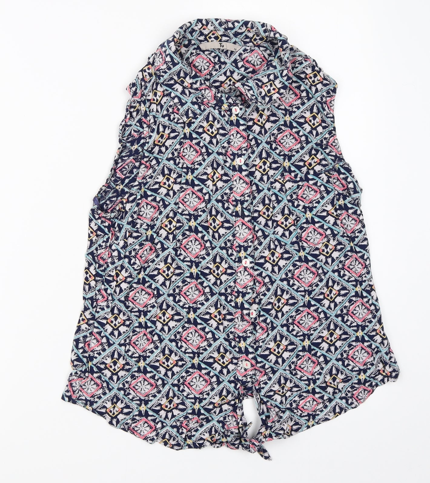 TU Womens Blue Geometric Basic Button-Up Size 10