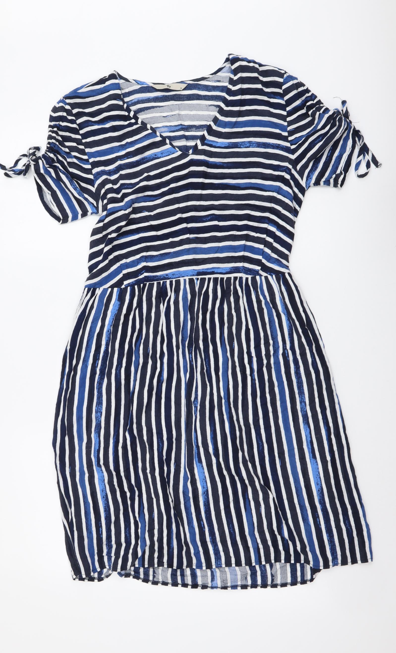 TU Womens Blue Striped Viscose A-Line Size 8 V-Neck Pullover