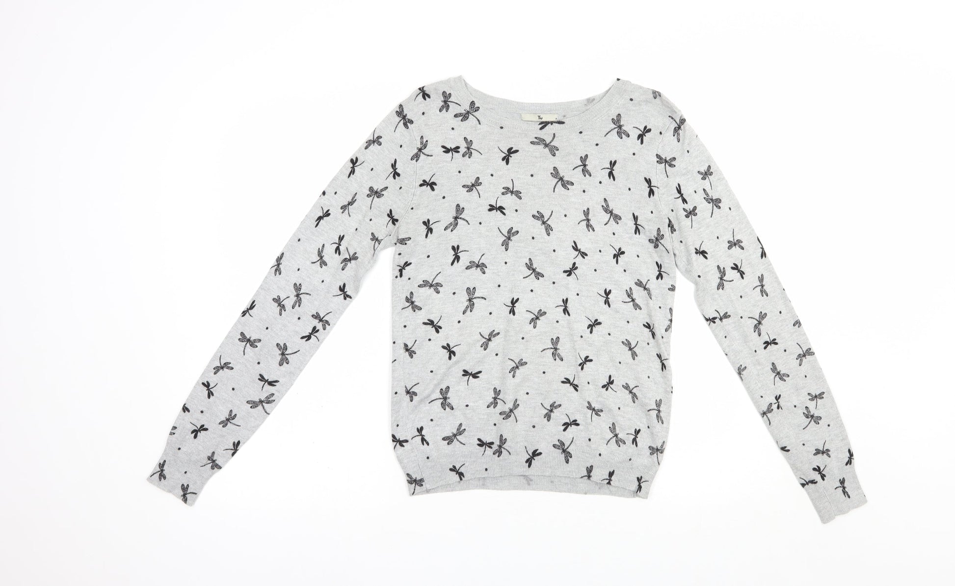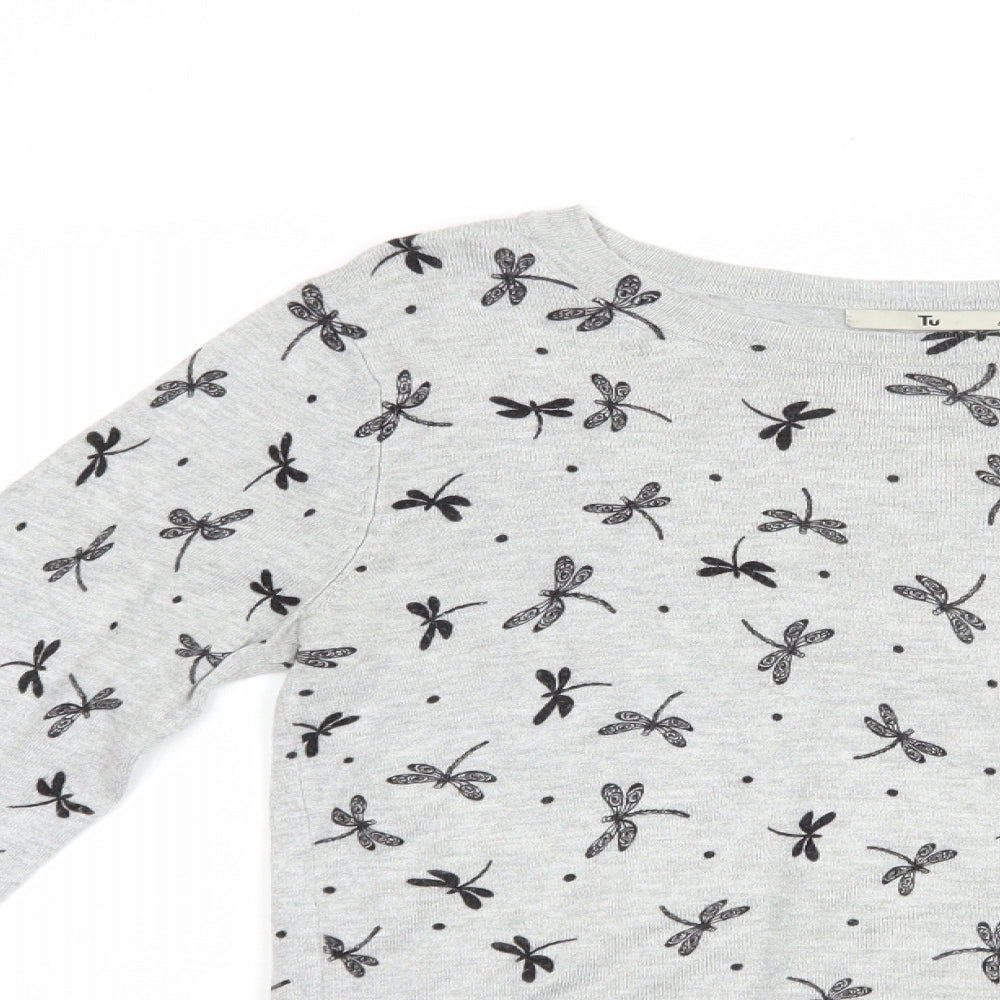 TU Womens Grey Boat Neck Geometric Viscose Pullover Jumper Size 8 - Dragonfly Print
