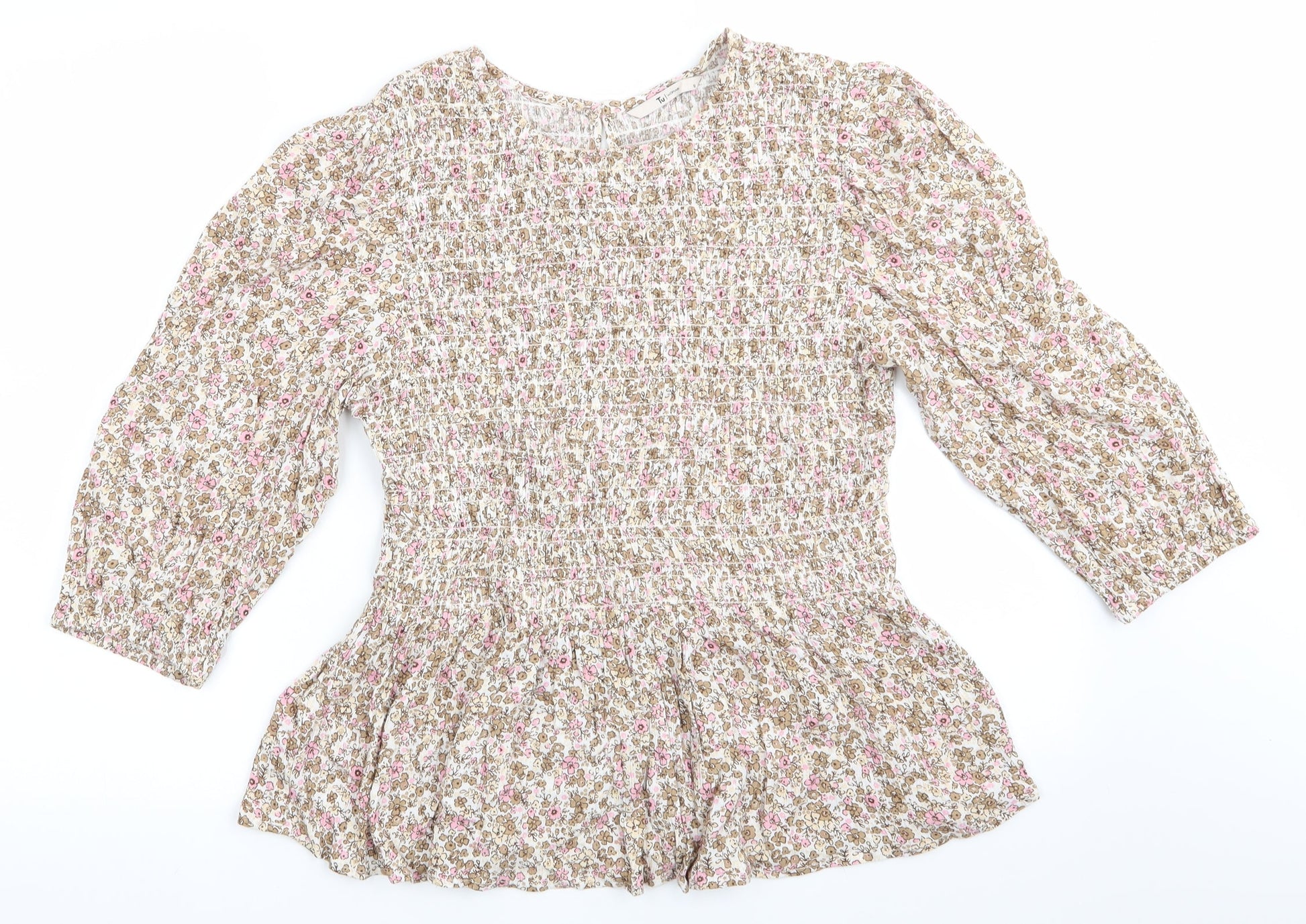 TU Womens Ivory Floral Viscose Tunic Blouse Size 10 Round Neck - Pink Taupe Beige Flowers Elasticated Bodice