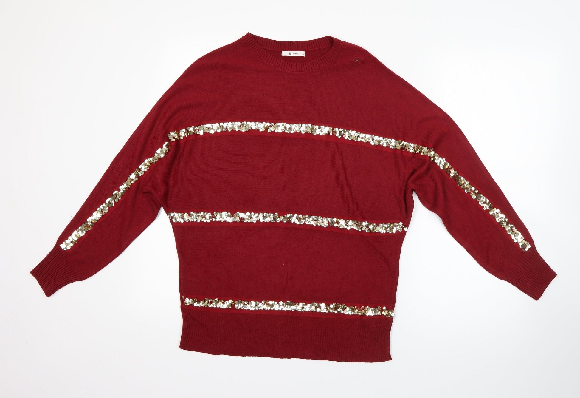 TU Womens Red Round Neck Striped Acrylic Pullover Jumper Size 8