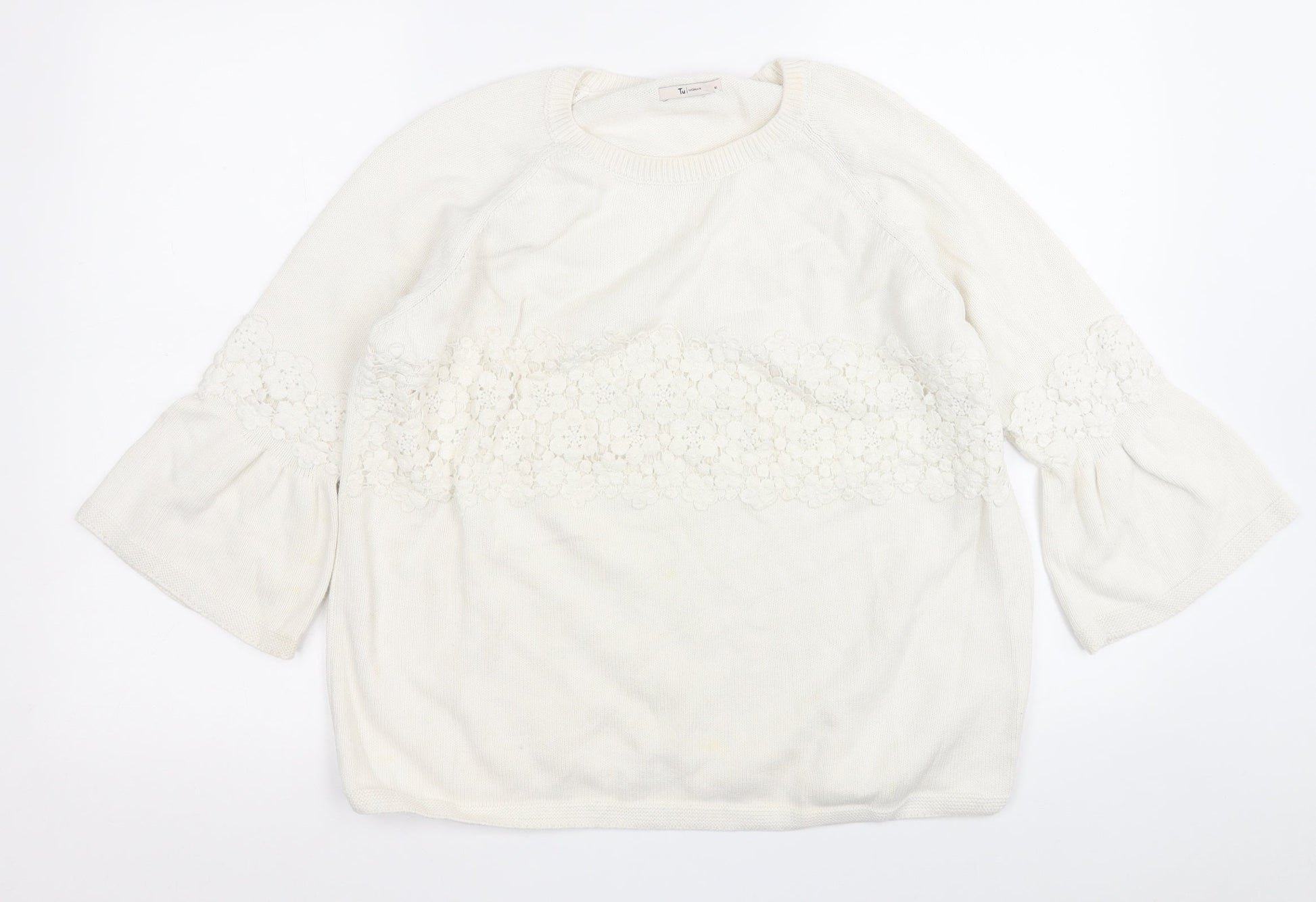 TU Womens White Round Neck Floral Cotton Pullover Jumper Size 18