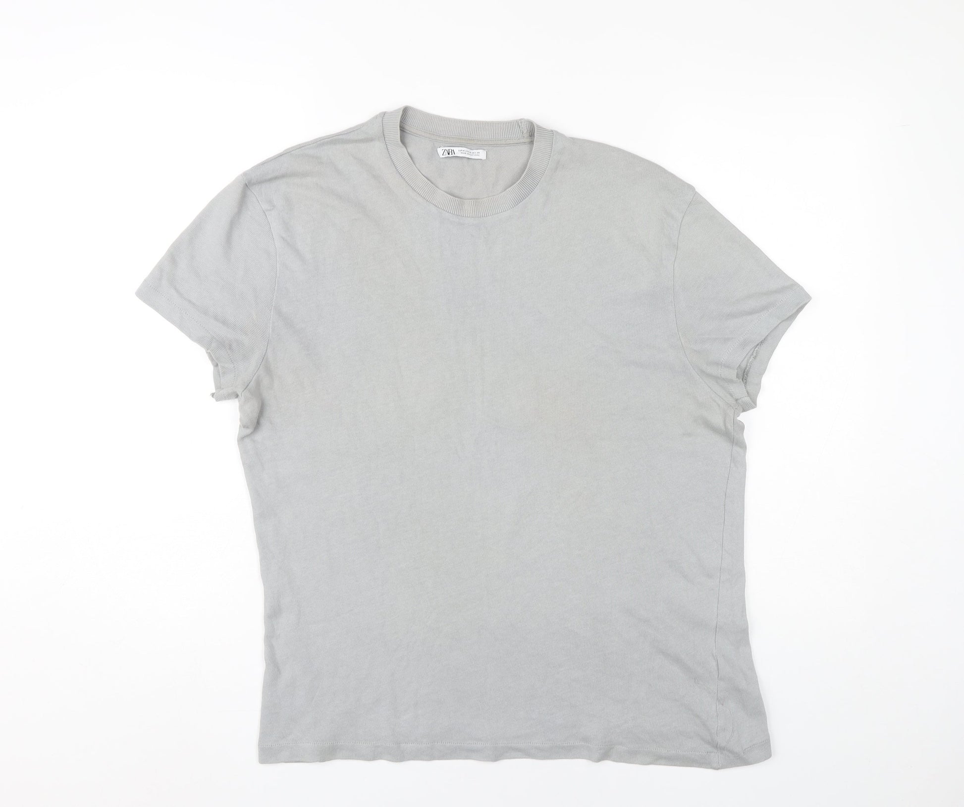 Zara Men Grey Cotton Crew Neck T-Shirt M Regular Fit Short Sleeve