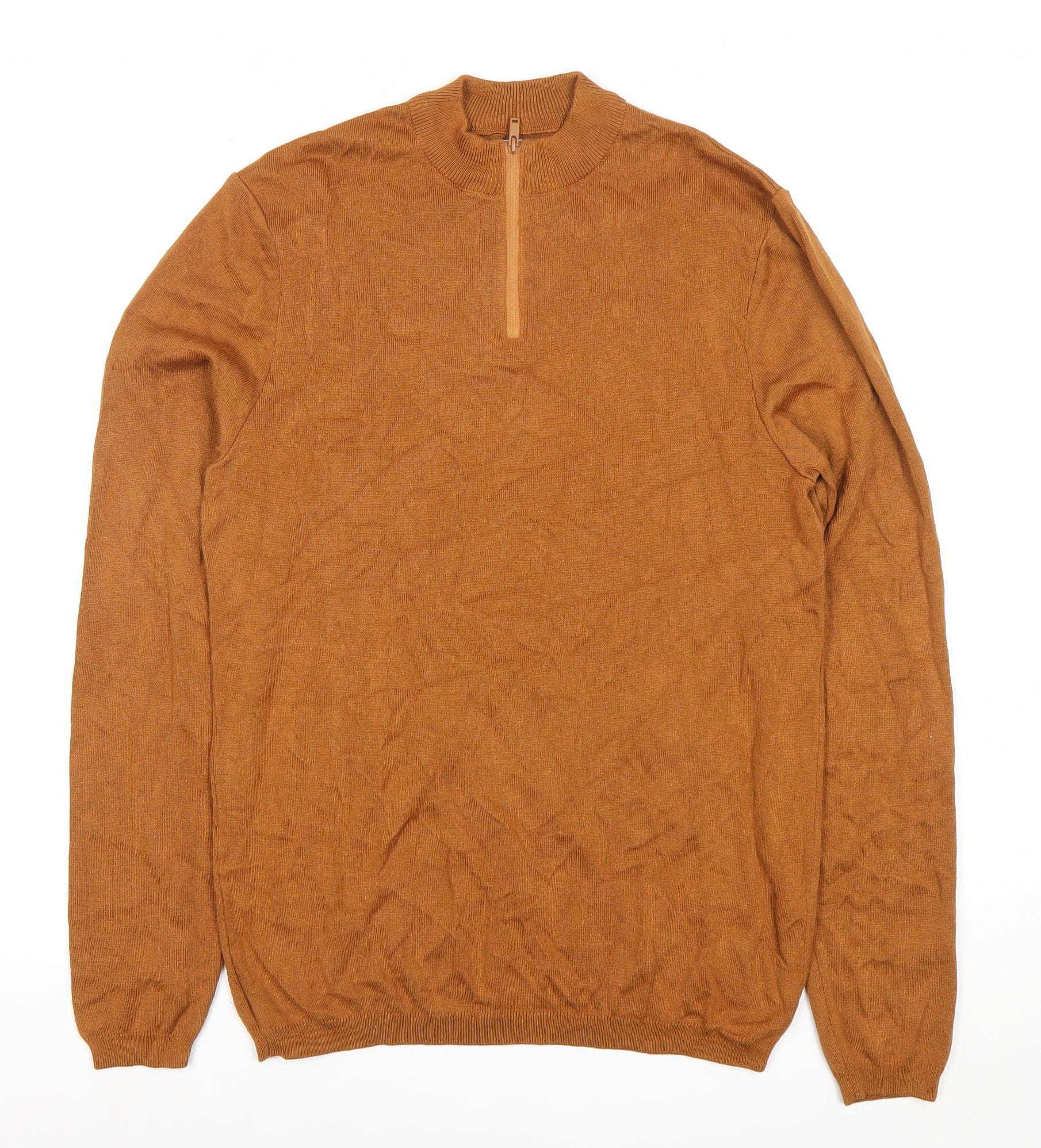 Zara Men’s Brown Mock Neck 1/4 Zip Jumper Size M Cotton Wool Blend