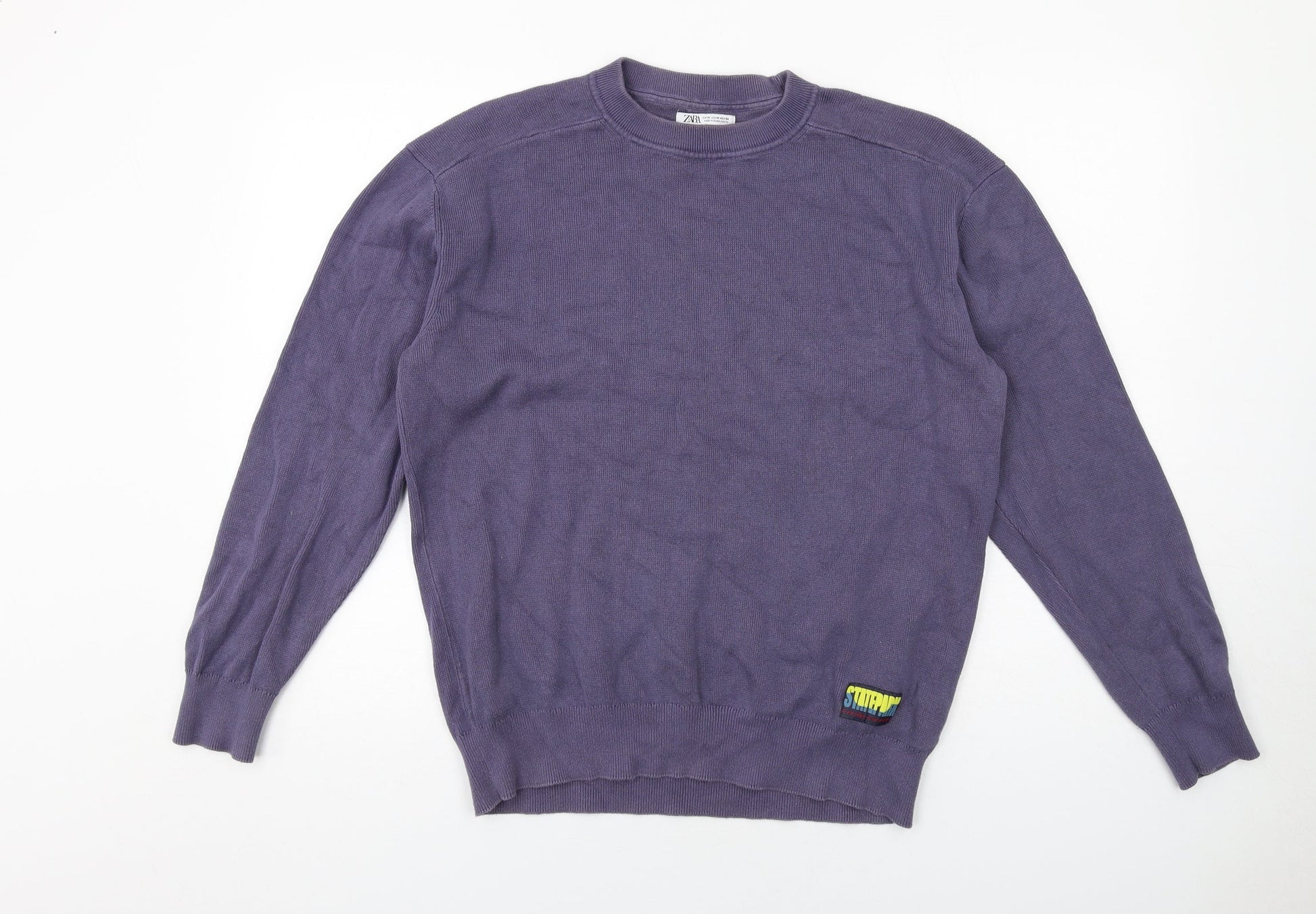 Zara Mens Blue Round Neck Cotton Pullover Jumper Size M Long Sleeve