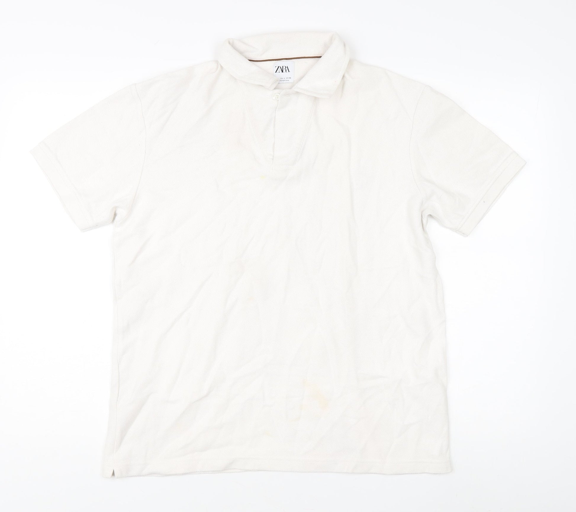 Zara Men's White Cotton Polo Shirt L Short Sleeve
