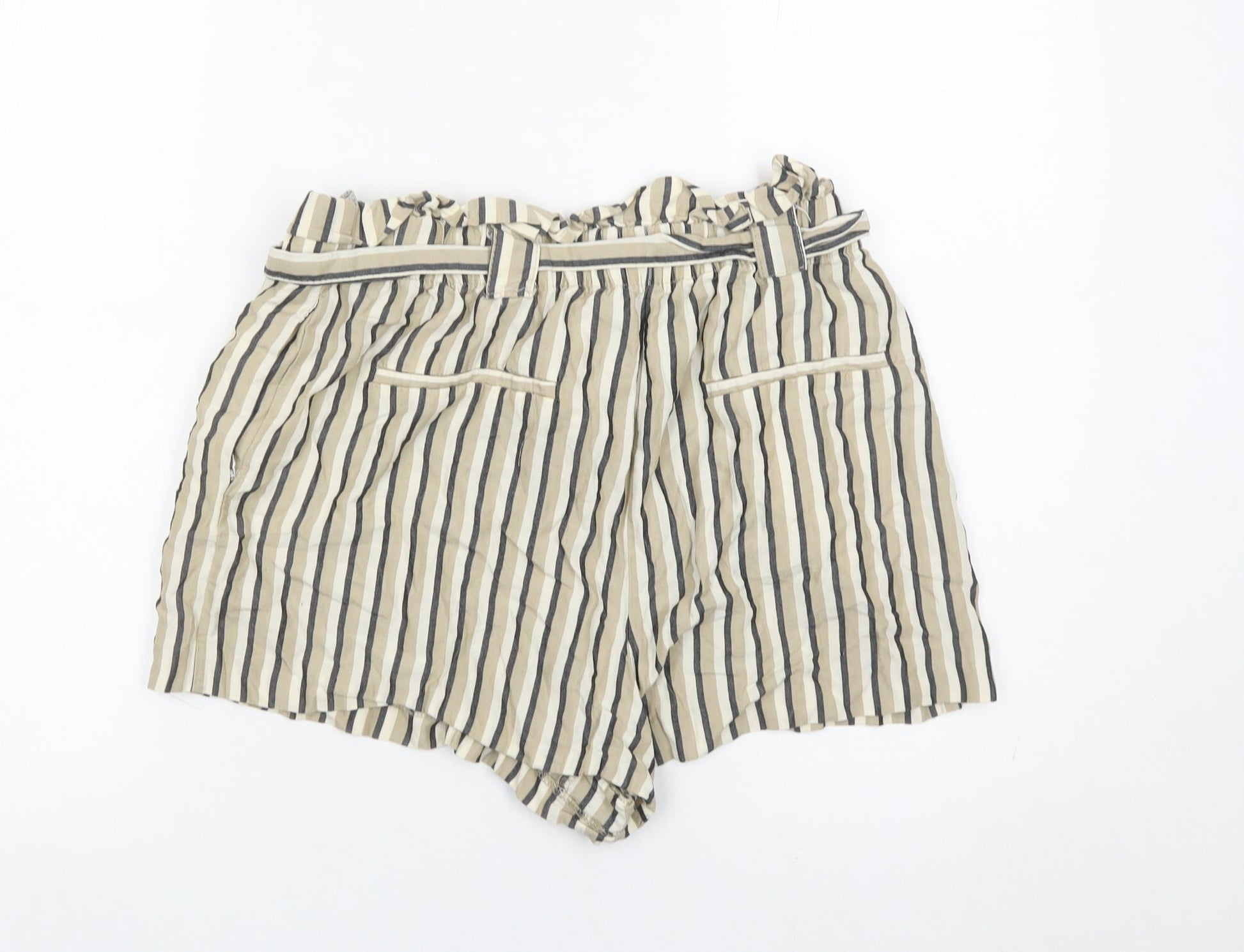 Zara Women Beige Striped Paperbag Shorts Size 14 Cotton High Waist