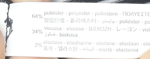 - Material Breakdown: 64% Polyester 34% Viscose 2% Elastane