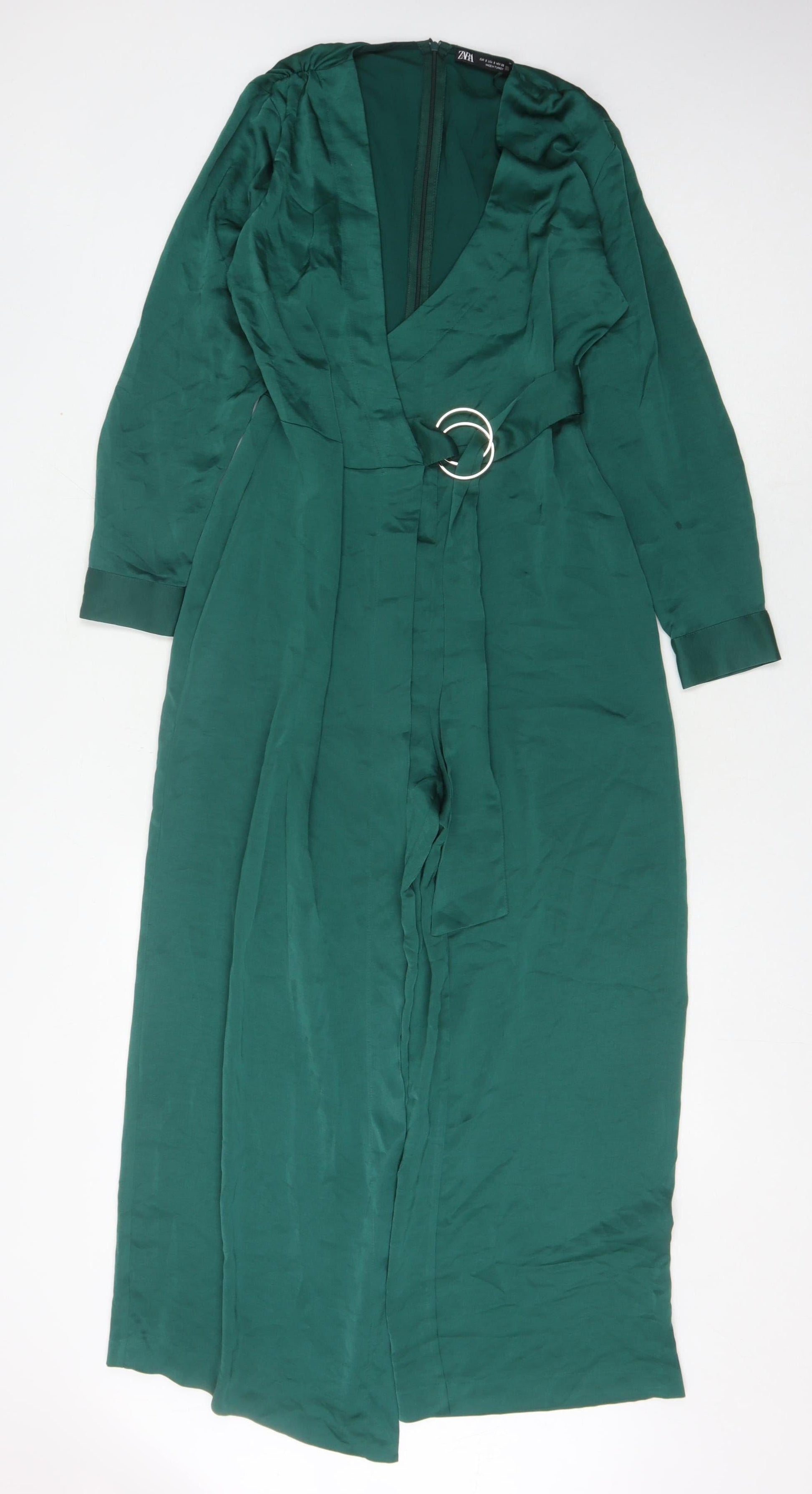 Zara Women’s Green Belted Jumpsuit, Size S, V-Neck Wide-Leg