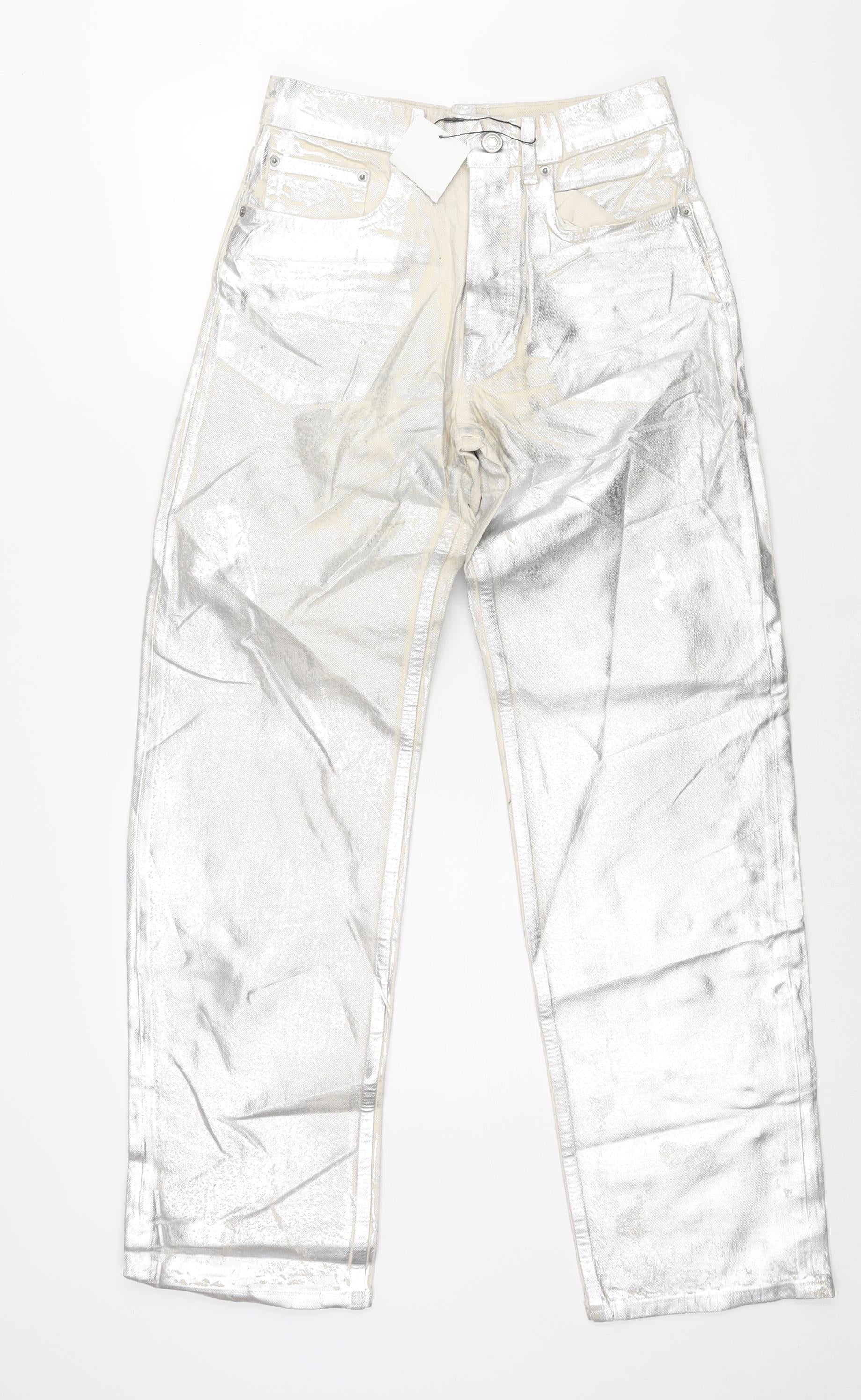 Zara Womens Silver Cotton Straight Jeans Size 10 L31 in Regular Button - Cracking Effect